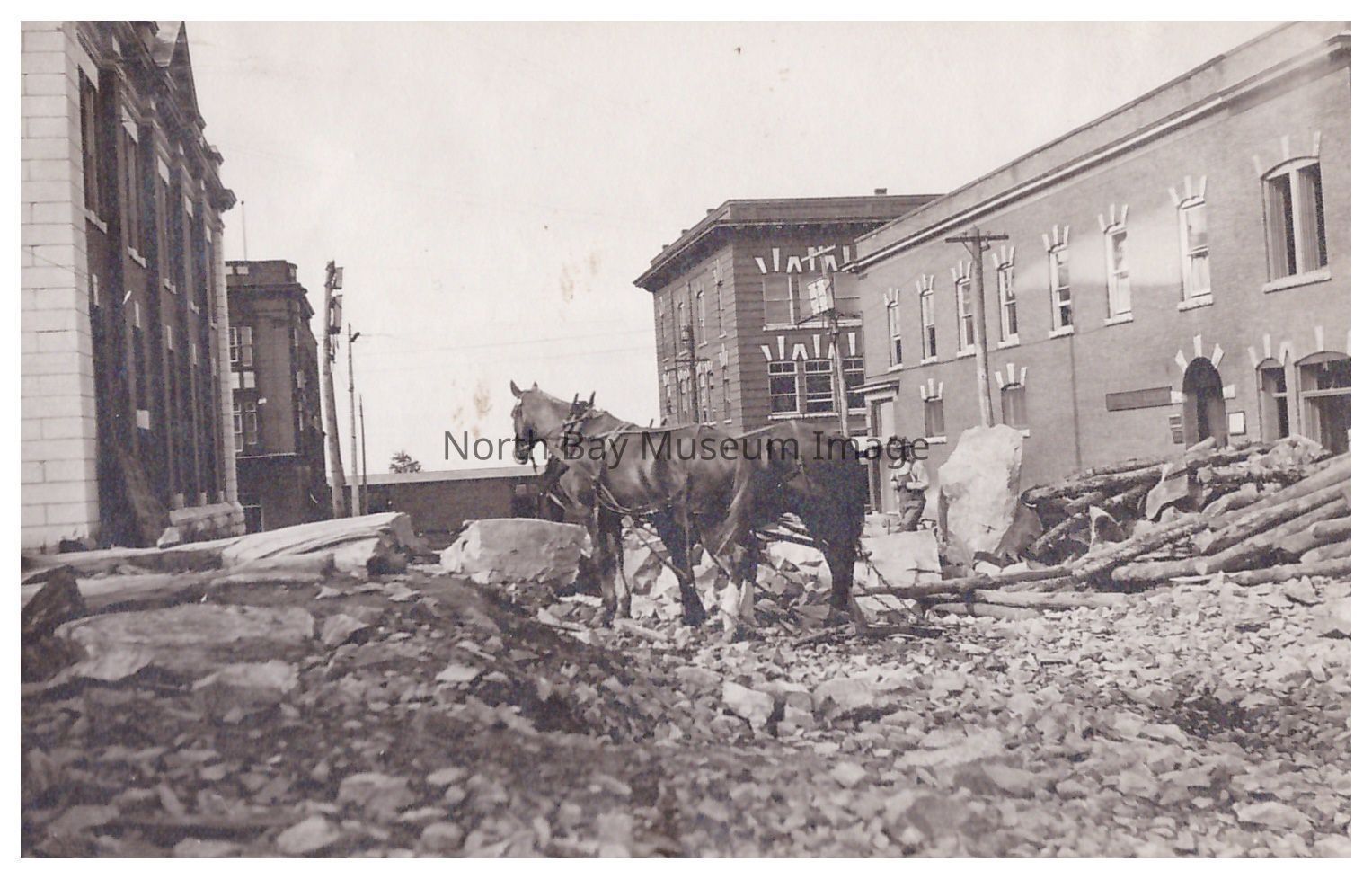 "Fraser St.- North Bay, Street Improvement - 1912 - North Bay, Main Street - North Bay - 1912" is written on the bristol board. These photos capture work being done to extend Fraser Street from Main to McIntyre (this work is referenced in Gunning's Book "North Bay Start Point, 1882").