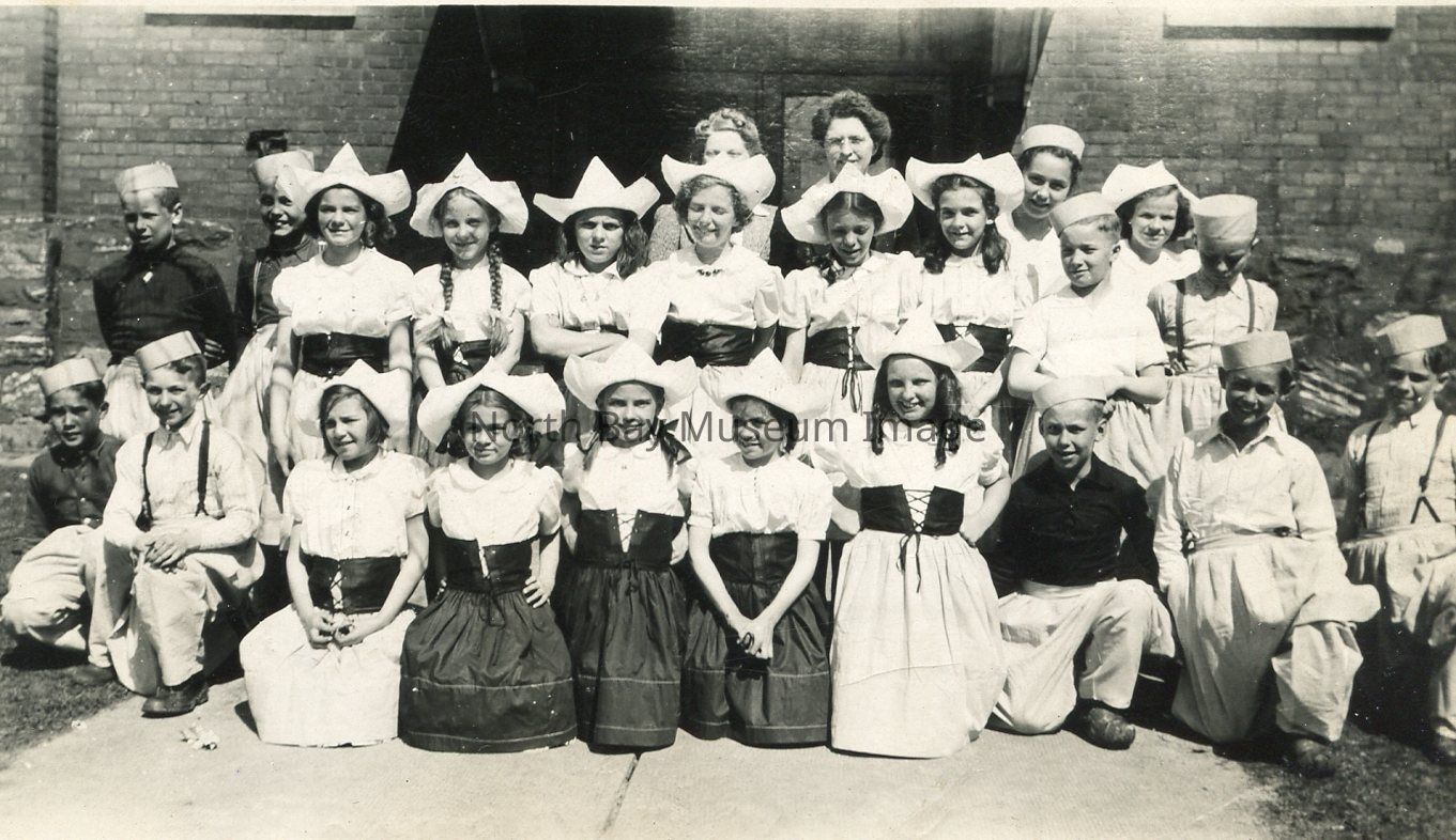 Black and white photographic print of Grade 5 class at McIntyre Street School (King Edward) in 1930's dressed in Dutch costumes for a play.