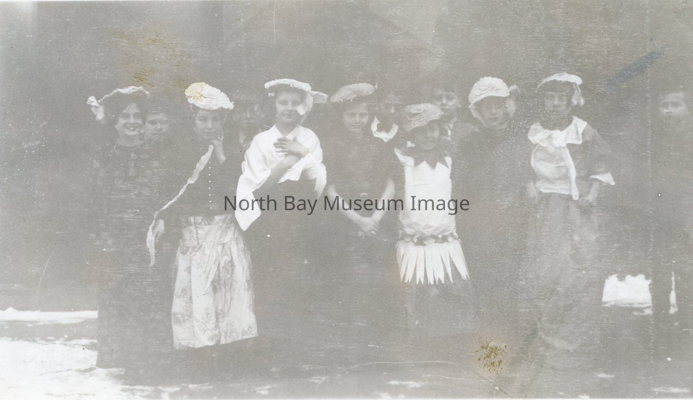 Black and white photographic print of group of girls from McIntyre Street School dressed up in a variety of costumes for a play.