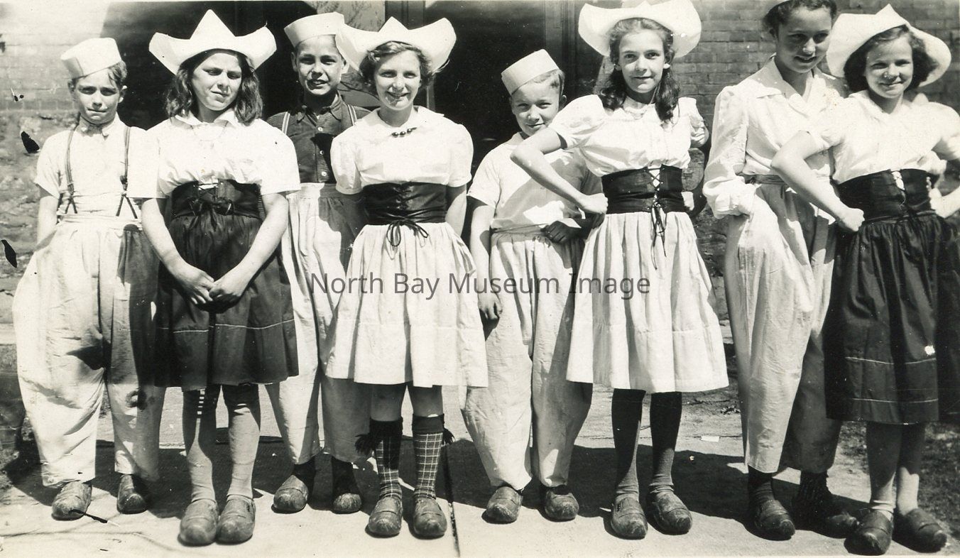students dressed up in Dutch costumes for a play