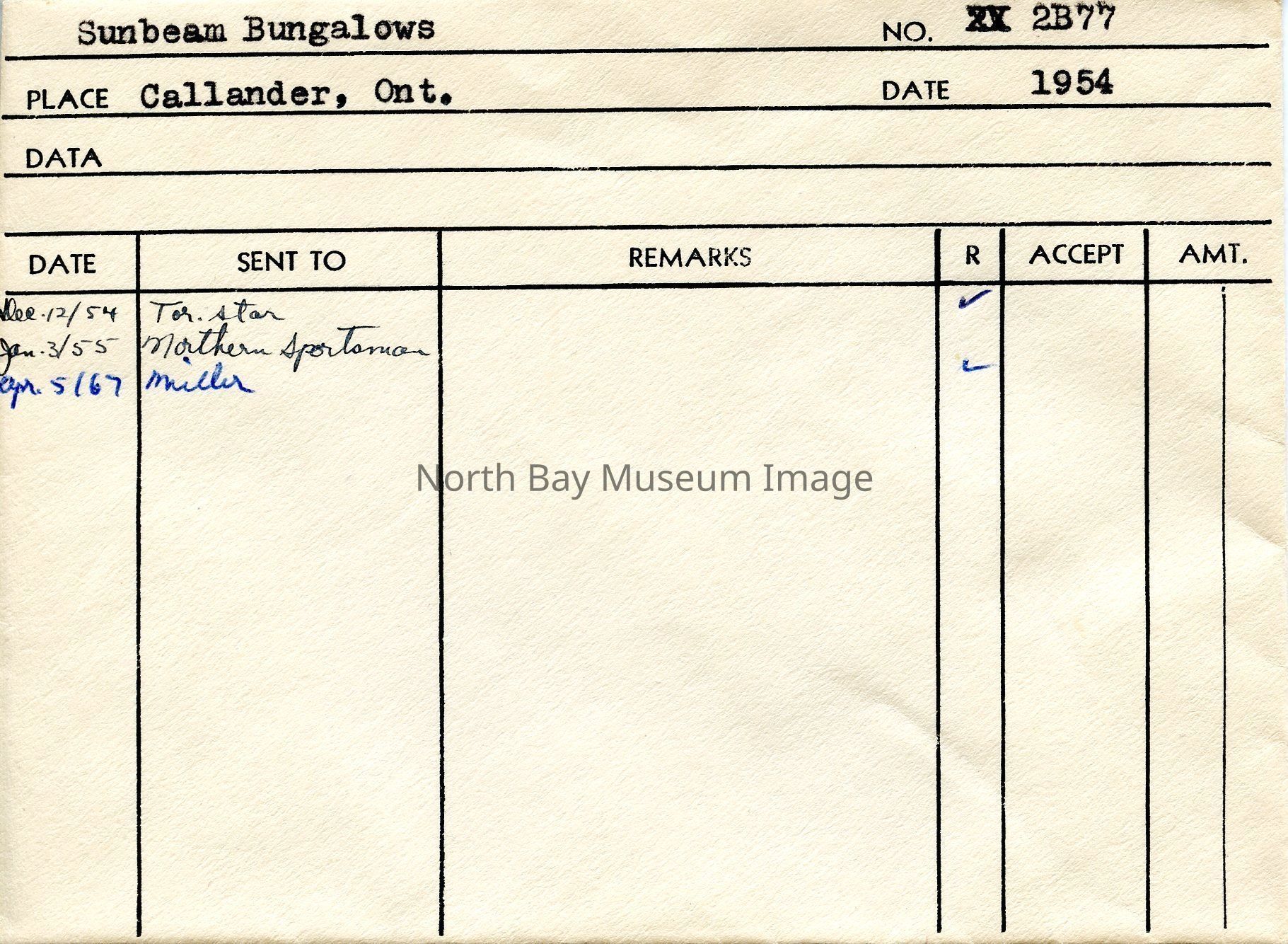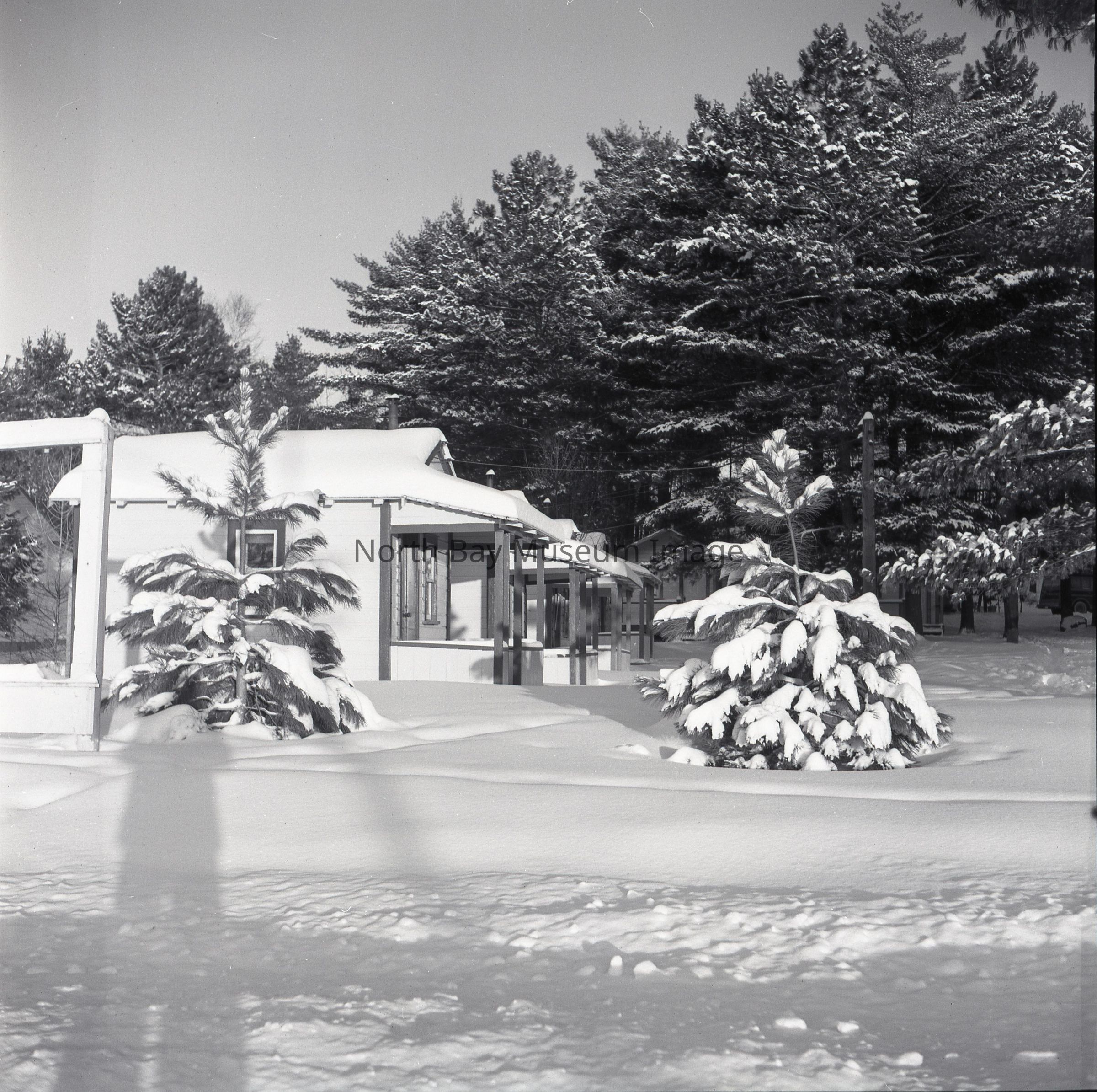 Envelope (a) containing photographs and negative (b-d) of the sunbeam bungalows. The negative and photograph capture images of the sunbeam bungalow covered in snow during the winter. The photographs are taken from the side of the home, there is snow covering the home as well as the trees in front of it. A part of the Forder Collection. The photographers original number is 2B77. All of the photographs publications are listed on the the envelope.Creator