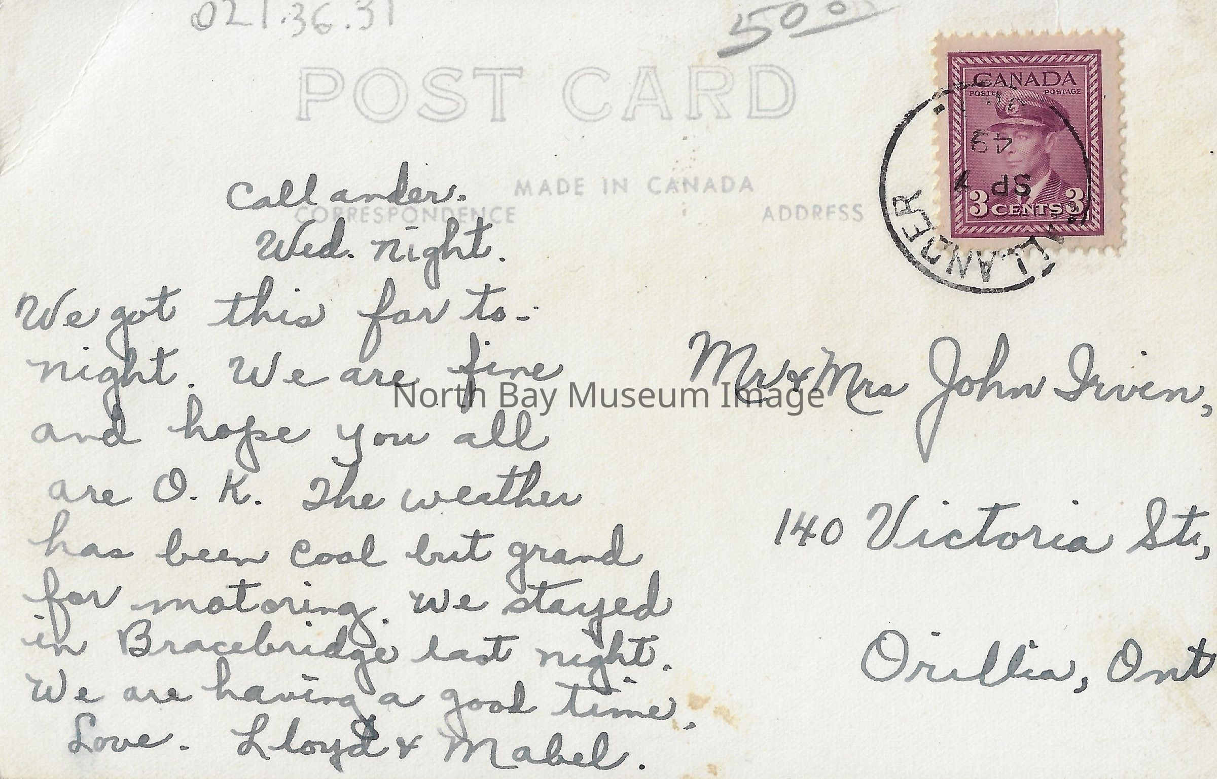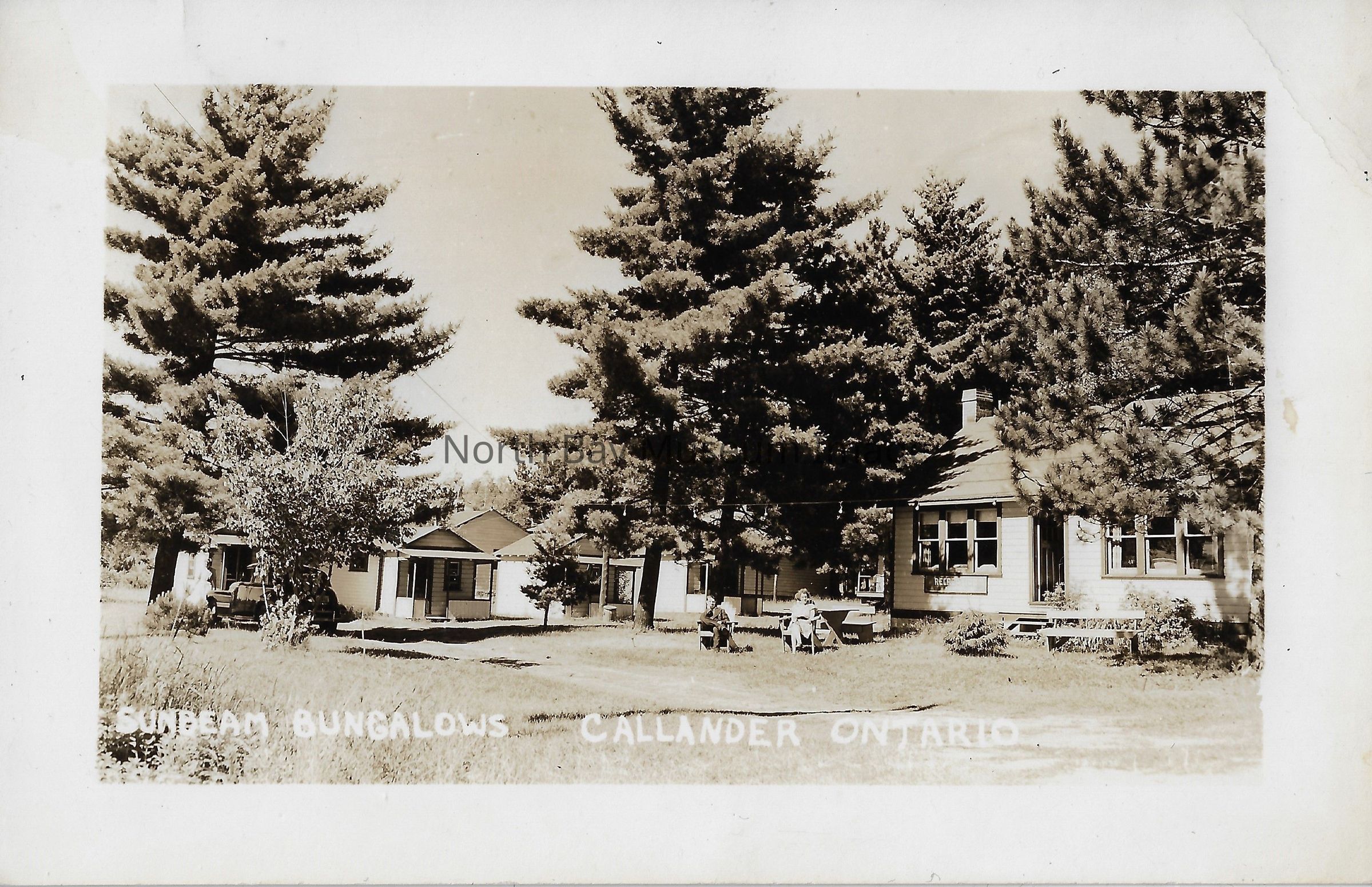 Black and white postcard. The postcard is taken from aback looking at a handful of small white bungalows. The bungalows appear to be built in a more wooded area. There is trees and vegetation growing around the bungalows which are not positioned in any type of uniform order. This postcard is titled: "Sunbeam Bungalows Callander Ontario". Inscription on back: "Callander. Wed. Night. We got this far to-night. We are fine and hope you all are O.K. The weather has been cool but grand for motoring. We stayed in Bracebridge last night. We are having a good time. Love. Lloyd & Mabel. Mr & Mrs. John Irvin, 140 Victoria St, Orillia, Ont.", "Callander SP 7 49".