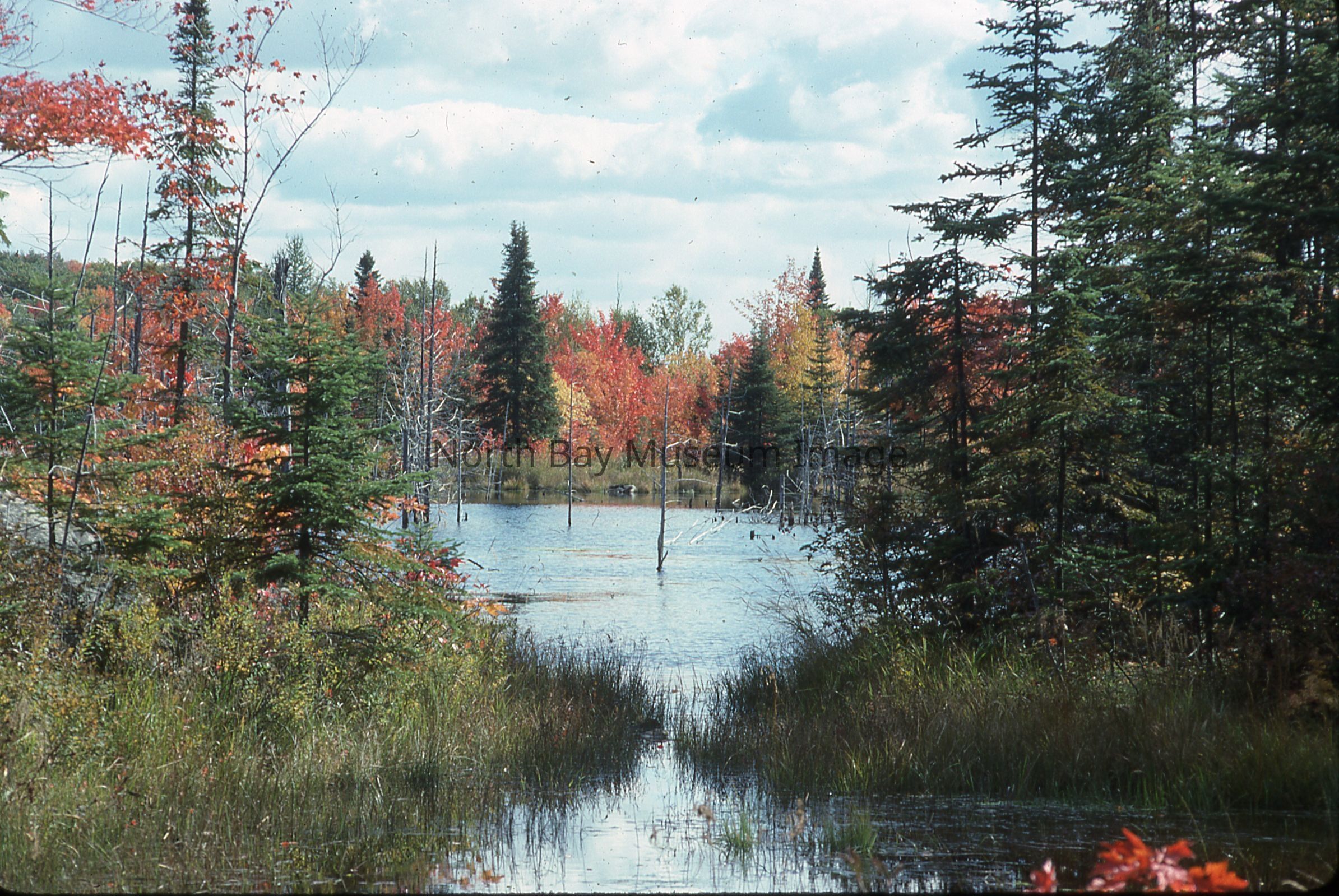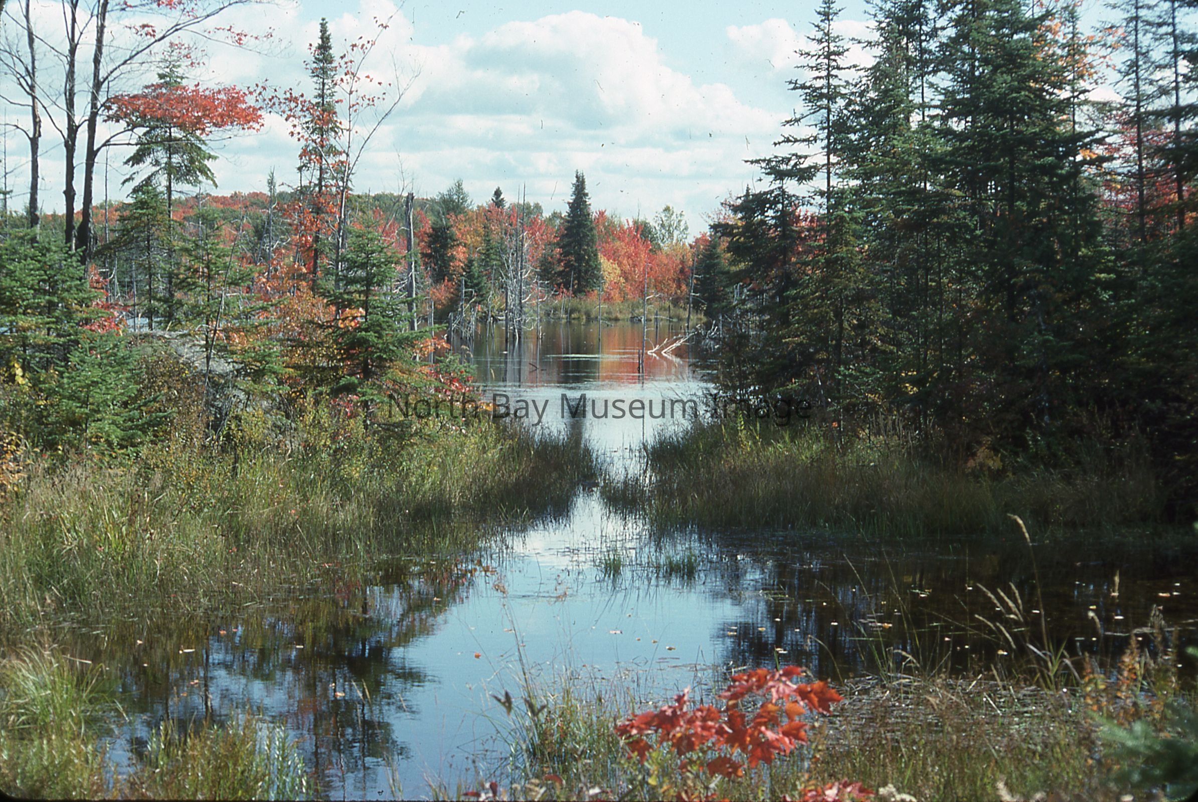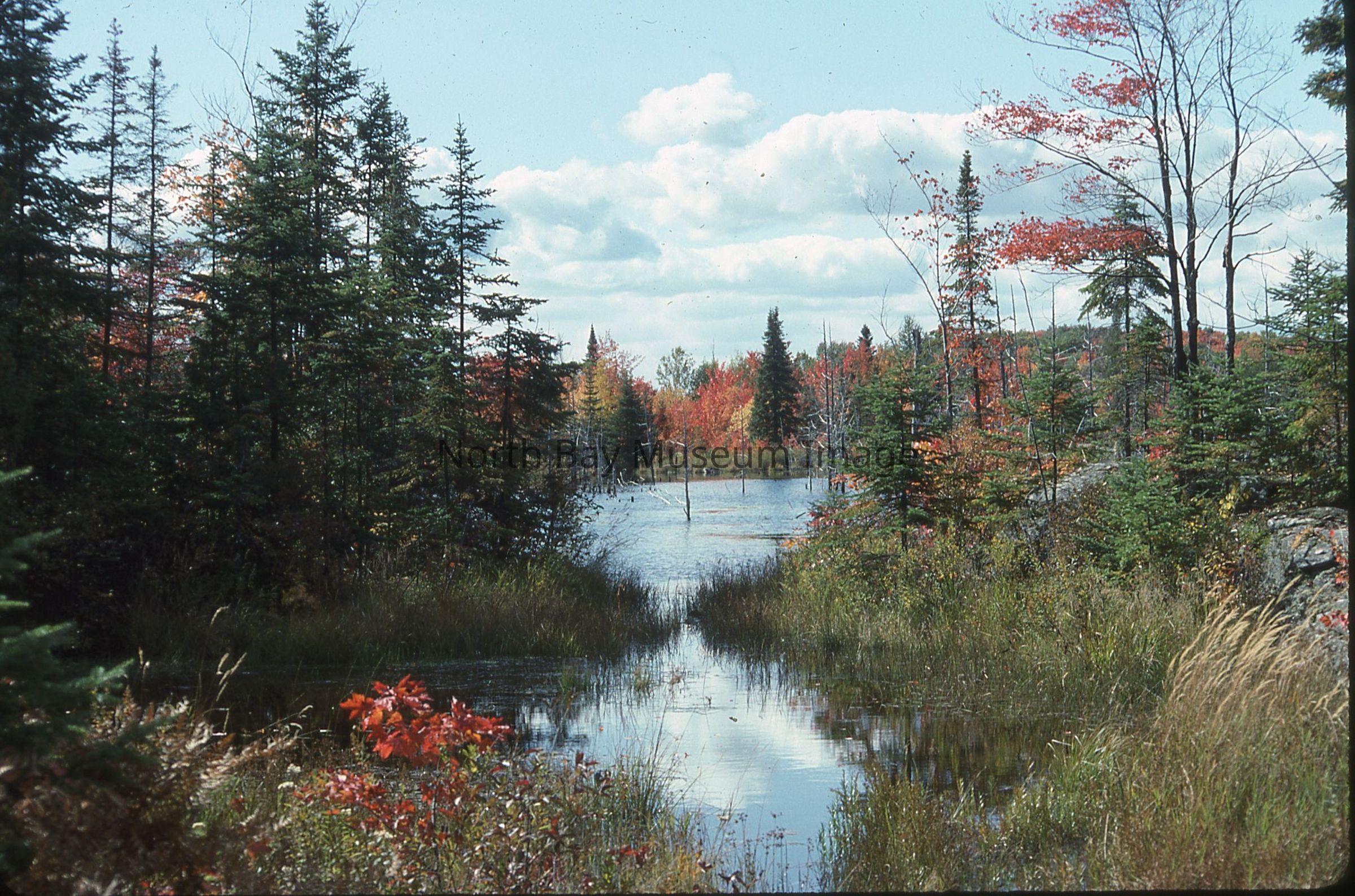 Envelope (a) containing slides (b-d) of a swamp in Autumn near Airport road in North Bay. Photo consists of nature shots of a swamp. The leaves are turning different colours and the water is calm. A part of the Forder Collection. Publication dates on the envelope. Photographers original number of photographs was 93-023.Creator
