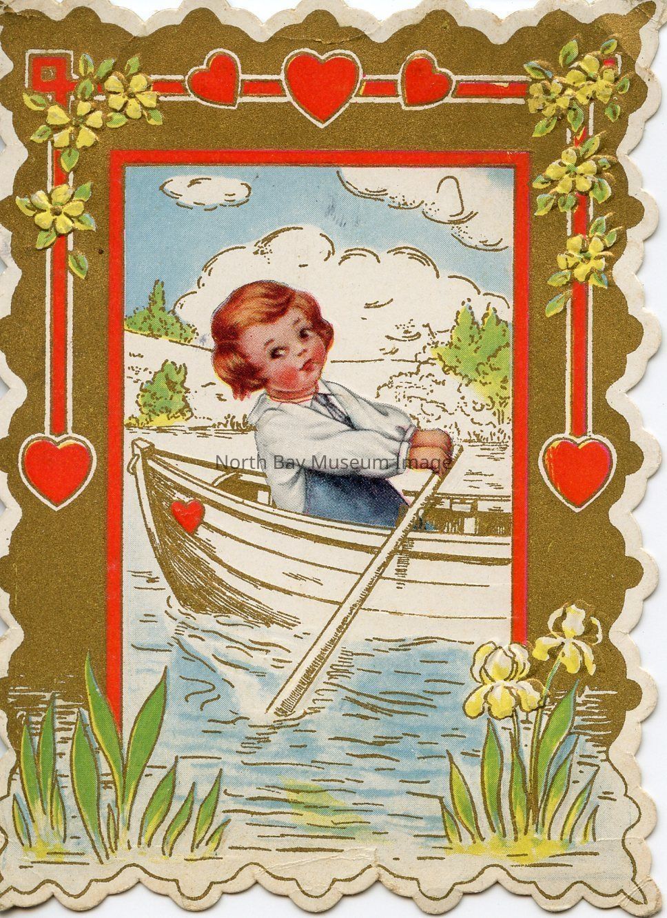 A Valentines Day card that is 4.5 inch x 3 inch. The front of the card has an image of a little child rowing a row boat. The boarder of the card is brown with small illustrations of flowers on it. The inside of the card has an illustration of a shy boy and girl looking at each other. They are both sitting on a bench. The inscription inside the card says "I'se sittin heah so solemn, I'se lonesome fur an' fru, I want a little sweetheart say don't you want one to." There is also a, personal note written in left side. This card is Whitney Made, Worchester Mass.