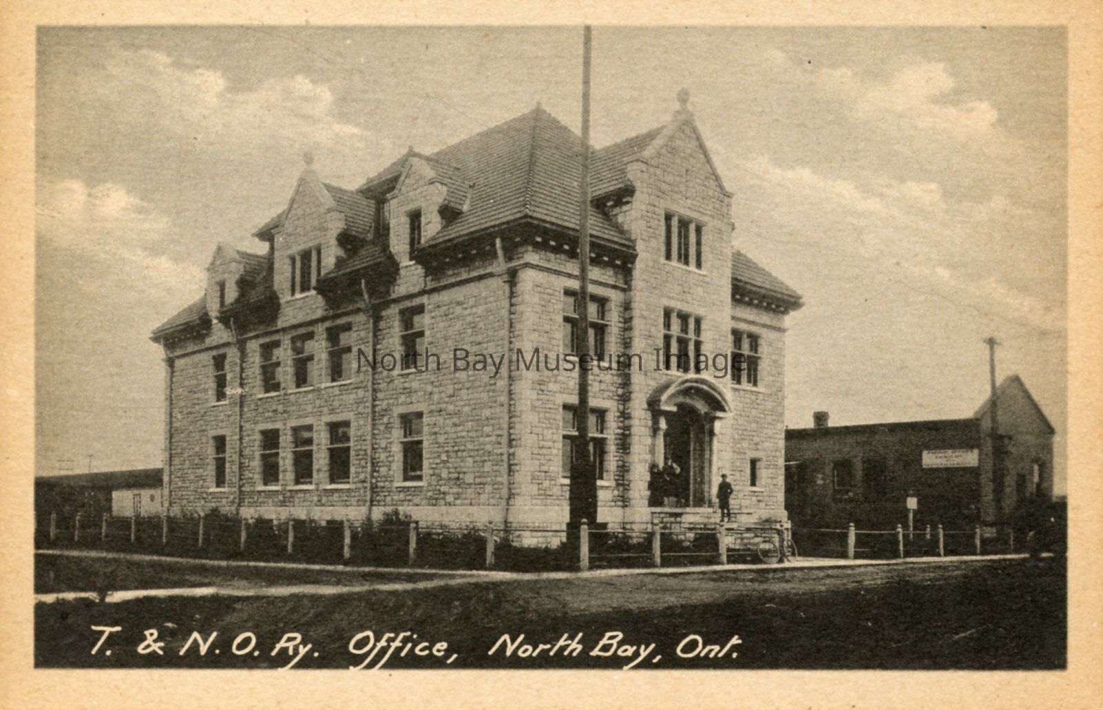 The Black and white post card is of T. & N.O. Rx office, North Bay (now Ontario Northland Archives). The image shows the two story building with people standing on the foundation. There is a building next to the office with a old car parked in front of it.