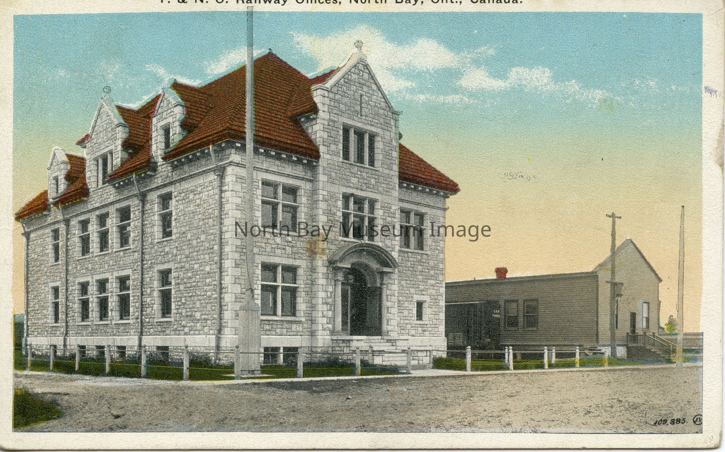 Postcard with Hand-colored photo of Temiskaming and Northern Ontario Railway Commission (later ONR) office building on Oak St. -- designed by architect Henry (Harry) Westlake Angus of London, Ontario. Freight shed is building to the right. Photo, taken from northeast side, is from between 1907-1915.