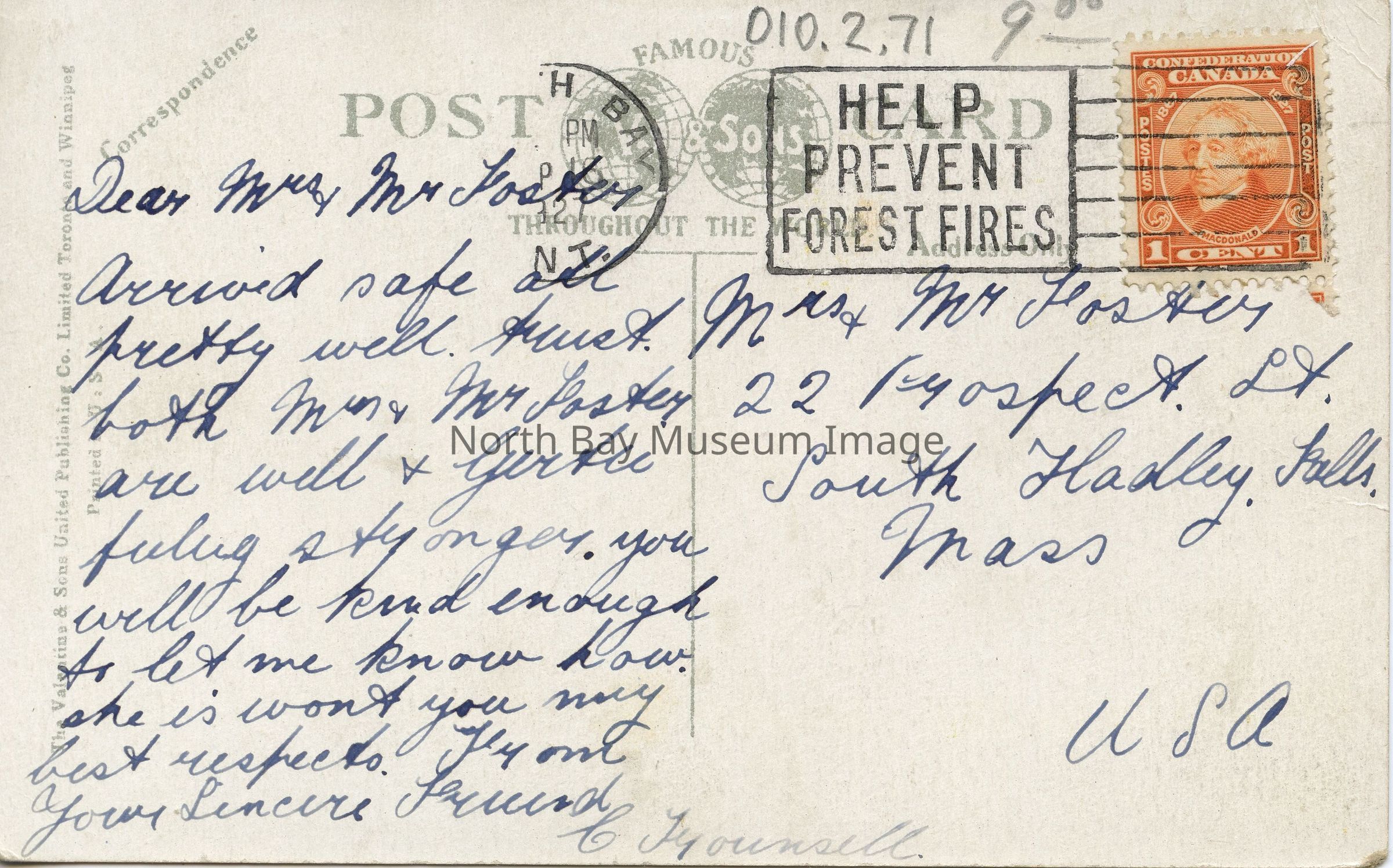 Addressee: Mrs & Mr. Foster, 22 Prospect St., South Hadley Falls, Mass, USA