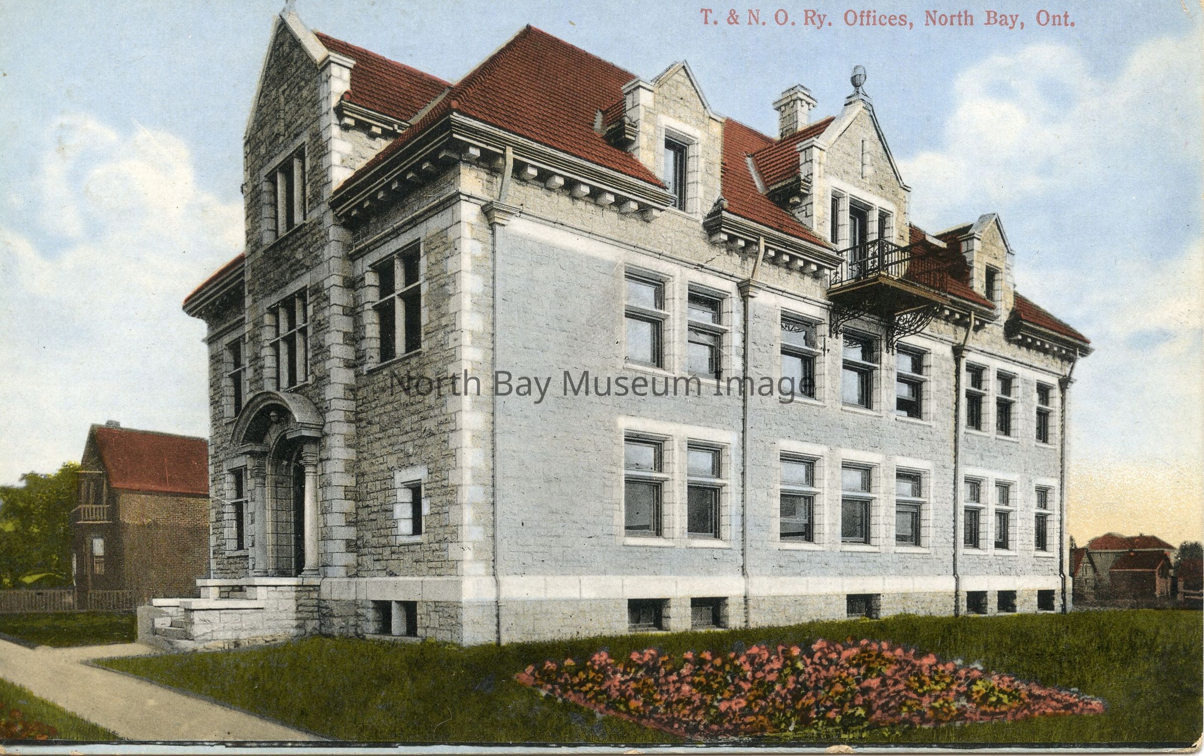 Postcard with color photo of Temiskaming and Northern Ontario Railway office (which later became the ONR) located at corner of Oak St. East and Regina St. Photo taken from west side of building. Designed by architect Henry (Harry) Westlake Angus of London, Ontario.