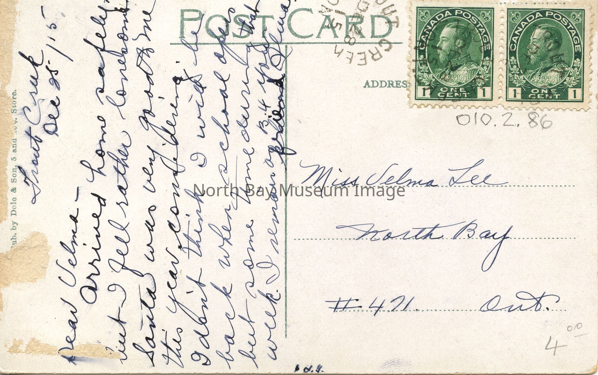 Addressee: Miss Velma Lee, North Bay, Ont. #471