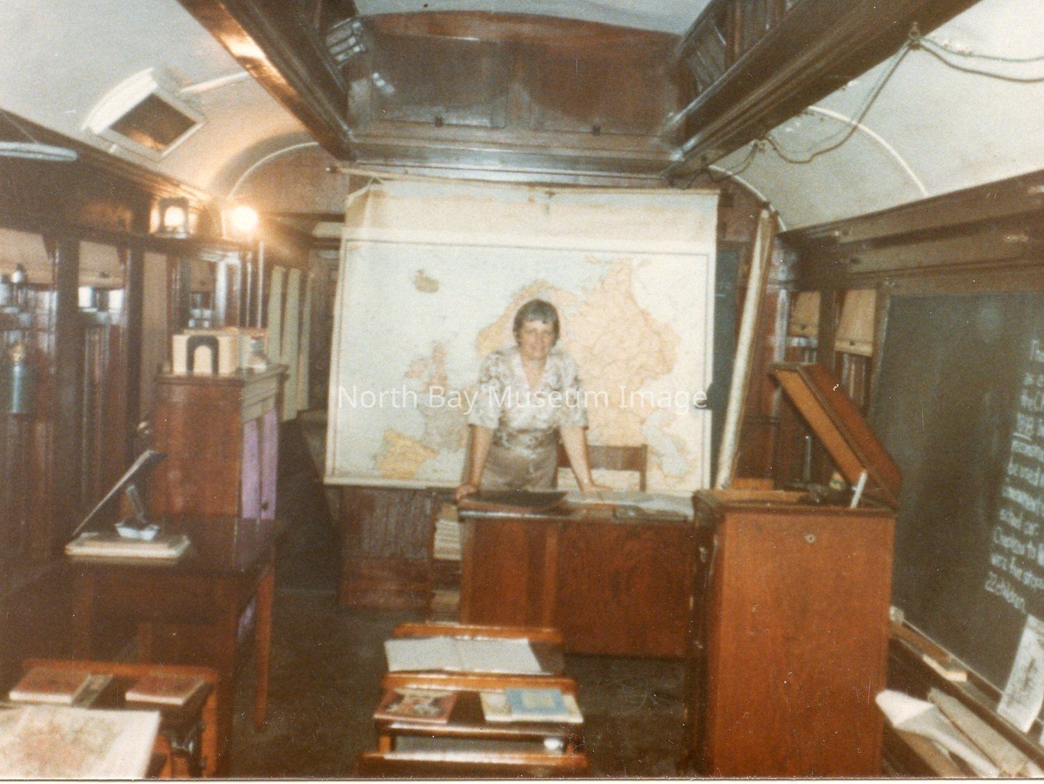 Colour photograph of the inside of the classroom car on the "School on Wheels" train -woman standing behind the desk at the front of the car -map of Europe on the wall behind the desk -print in good condition