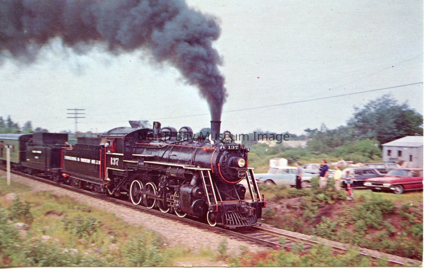 Postcard of the 'Temiskaming & Northern Ontario (#137).' The colour photograph shows the train moving along the railway. In the background people can be seen standing beside their parked cars beside tracks watching the train pass by. A thick cloud of smoke is seen coming from the train.