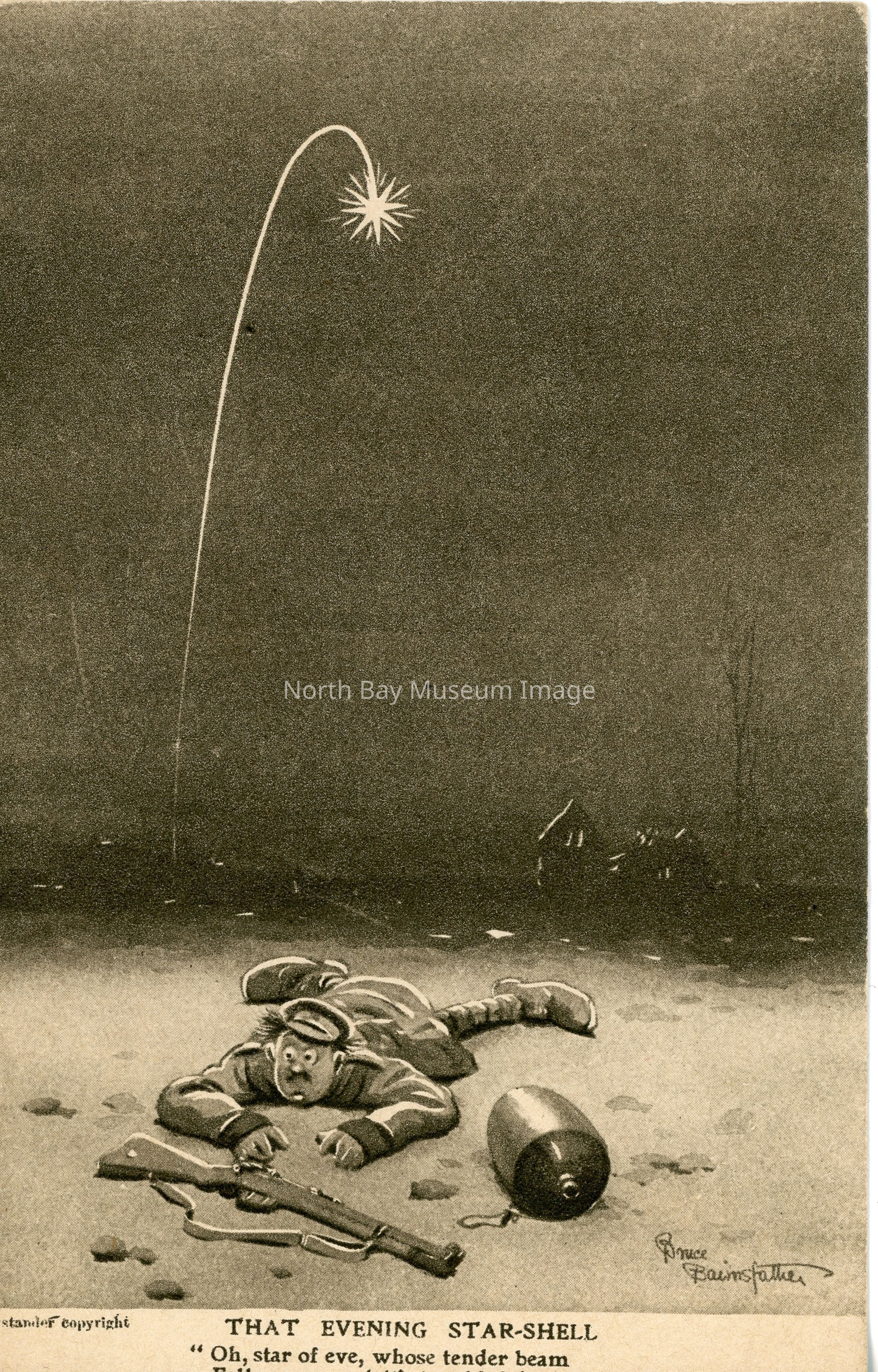 Sepia postcard on front is soldier lying flat with rifle house in background and "That Evening Star Shell" Part of Souter collection.