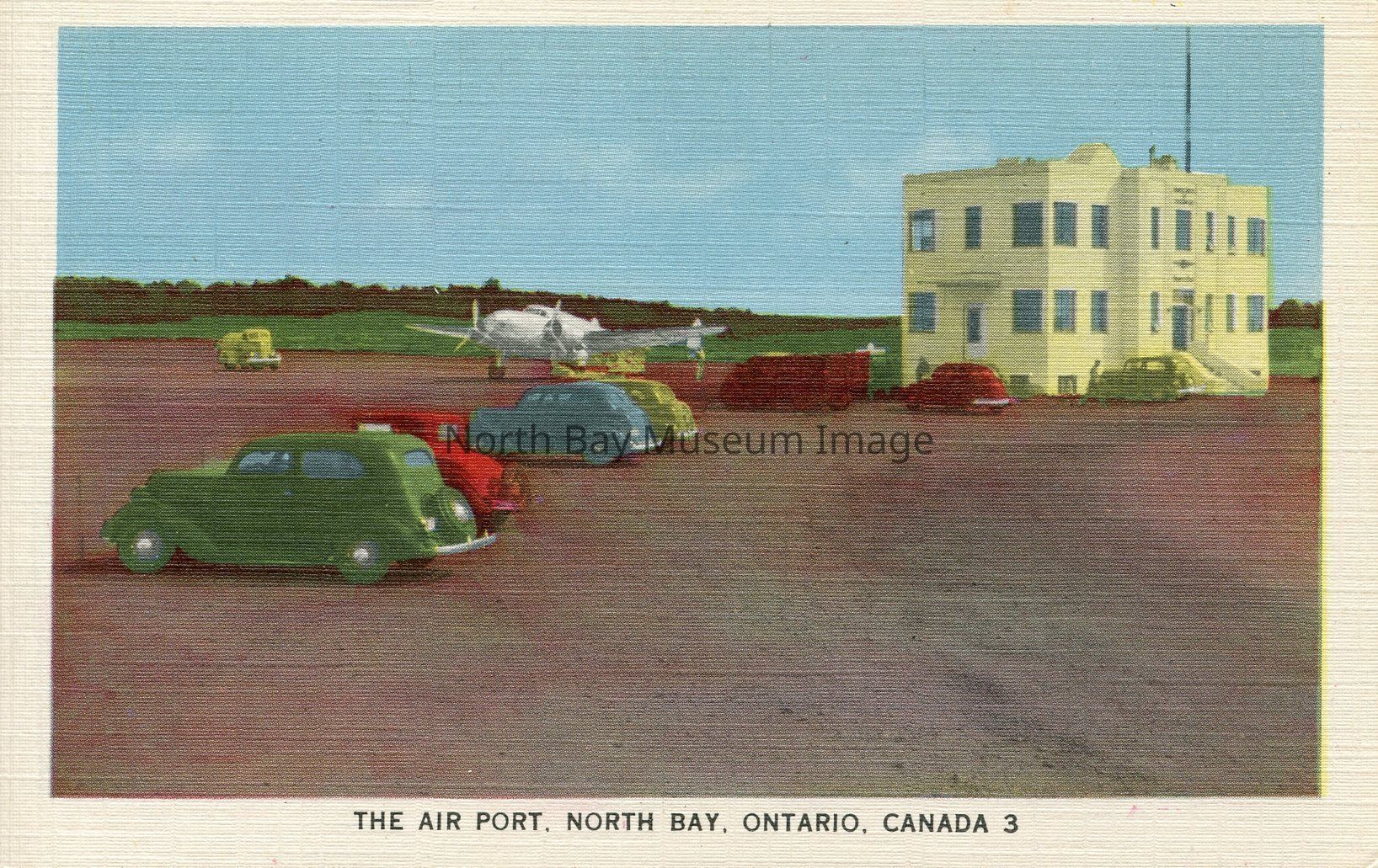 This is a coloured, 5 6/16"x 3 1/2" of North Bay Airport. This image shows seven cars in the foreground. In the background on the left hand side there is a airplane runway, with a plane parked on it. There is also a small truck parked on the left hand side. On the right hand side there is a small white two storey building.