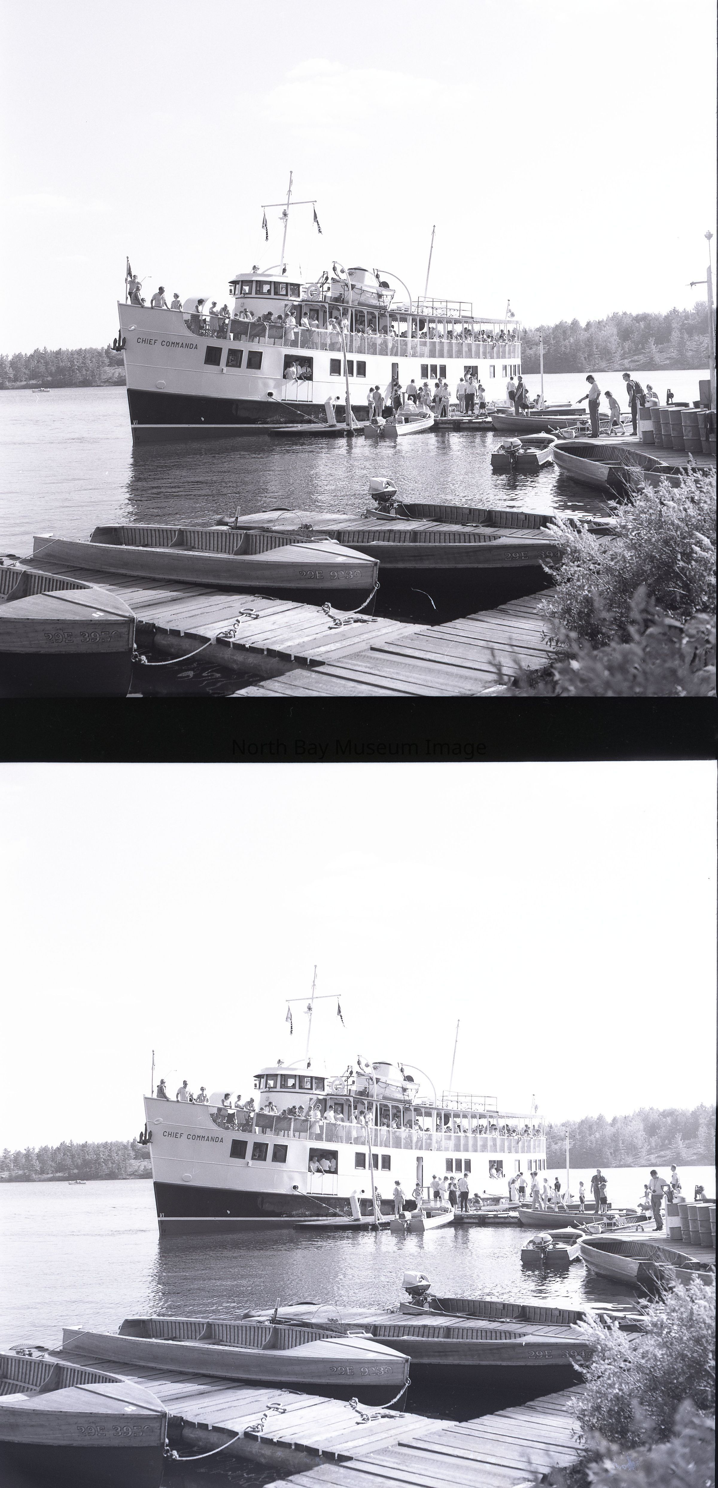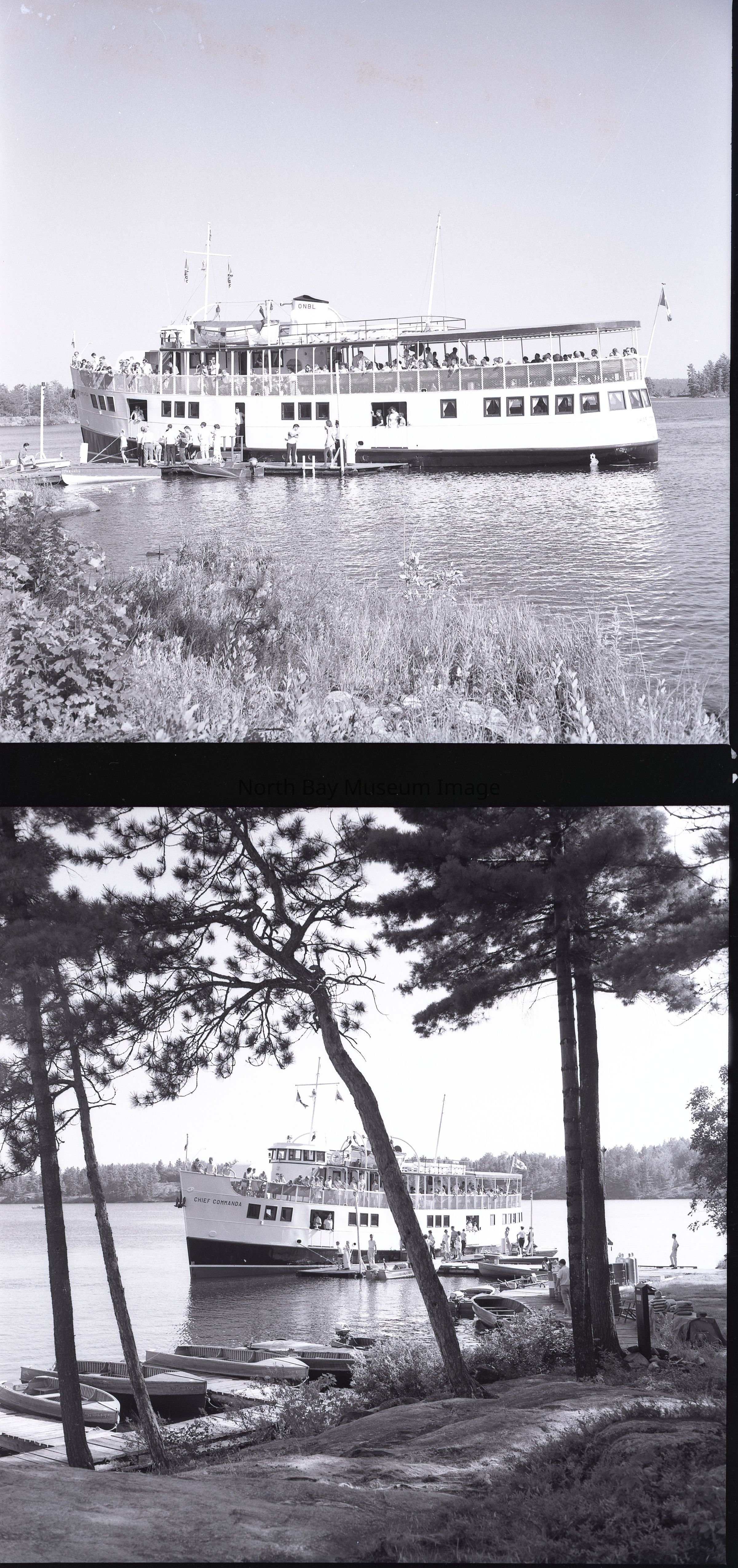 Photographer's Envelope (a) contained the negative and photograph (b-g) of The Chief Commanda docked at the Chaudiere Lodge on the French River. The image shows the boat docked as well as many people on the ship and on the dock. The images are taken from many different angles. One image is taken from back in the behind tree cover. It appears that alot of people are coming off of the boat. Original publications noted on the envelope. A part of the Forder Collection.Creator