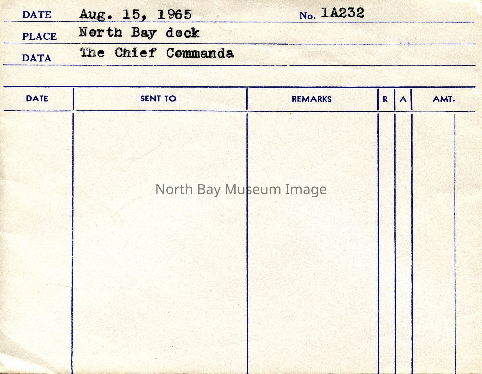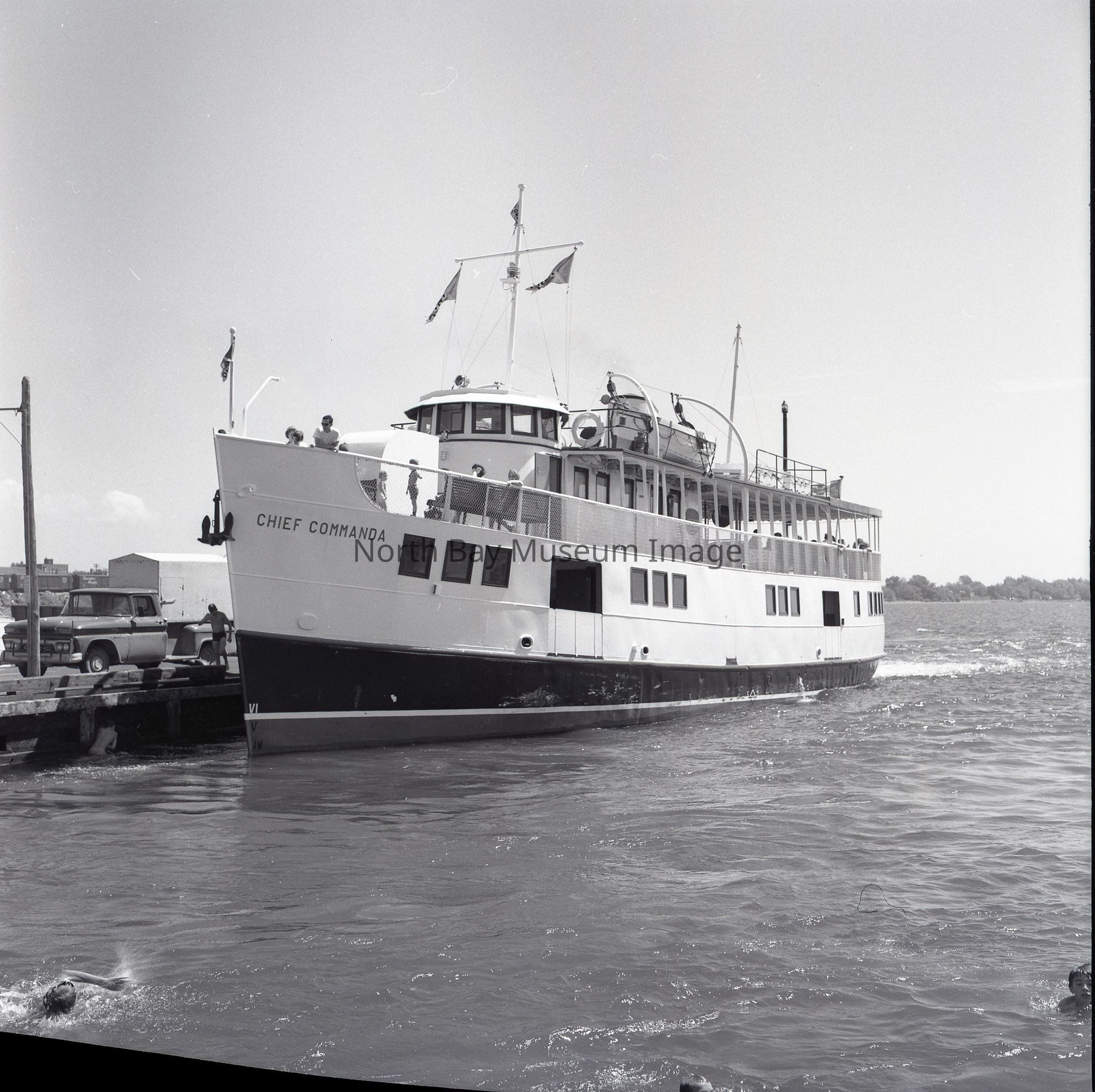 Photographer's Envelope (a) contains the photographs and negatives (b-c) of the Chief Commanda docked in North Bay. The images shows an up close picture of the the Chief Commanda docked in North Bay. There is people that canbe seen sunbathing on the boat. The original accession numbers for this photo is 1A232. This image is a part of the Forder Collection.Creator