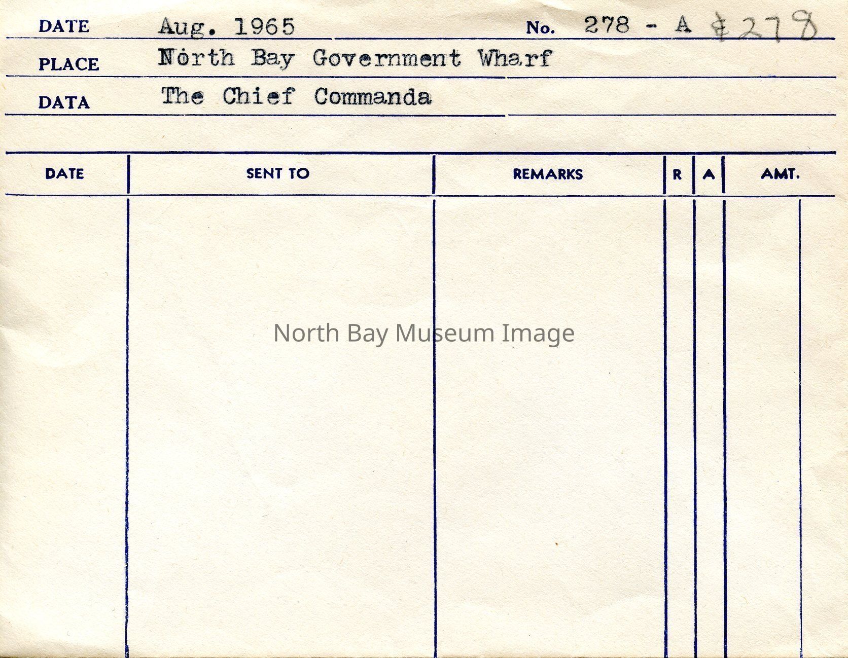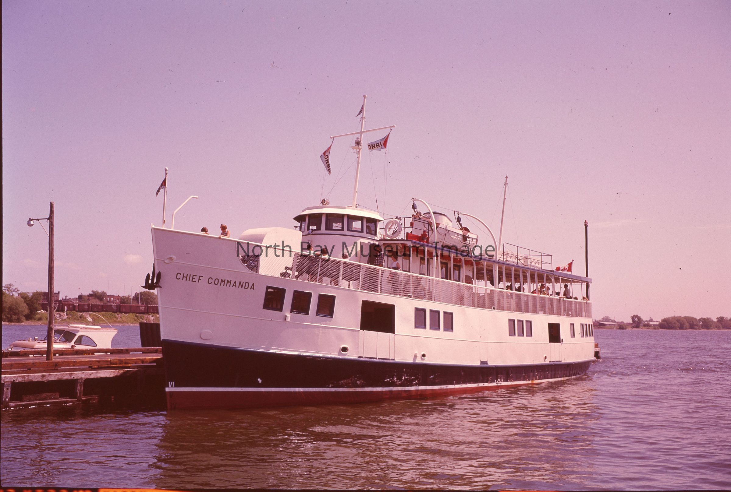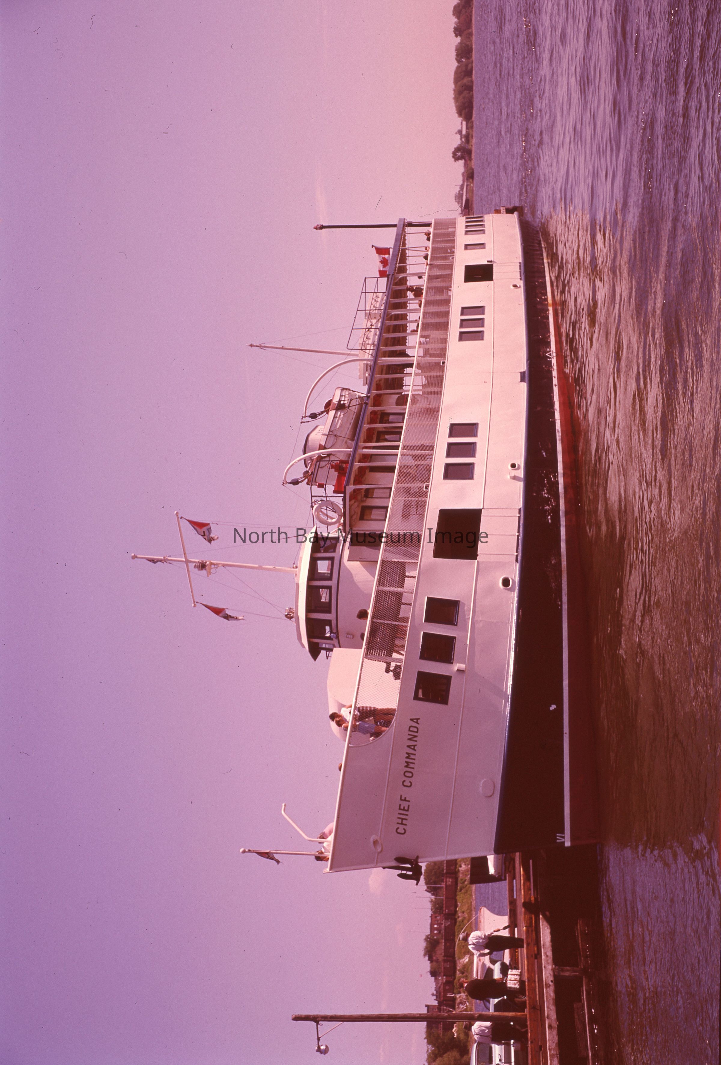 Envelope (a) contains the negatives (b-c) of the Chief Commanda at the North Bay Government Wharf. The images shows the Chief Commanda docked in the water at the North Bay Government Wharf. there is also people who can be seen on the boat, as well as people waiting to get on the boat. The photographers accession numbers for these images is 278. This image is a part of the Forder Collection.Creator
