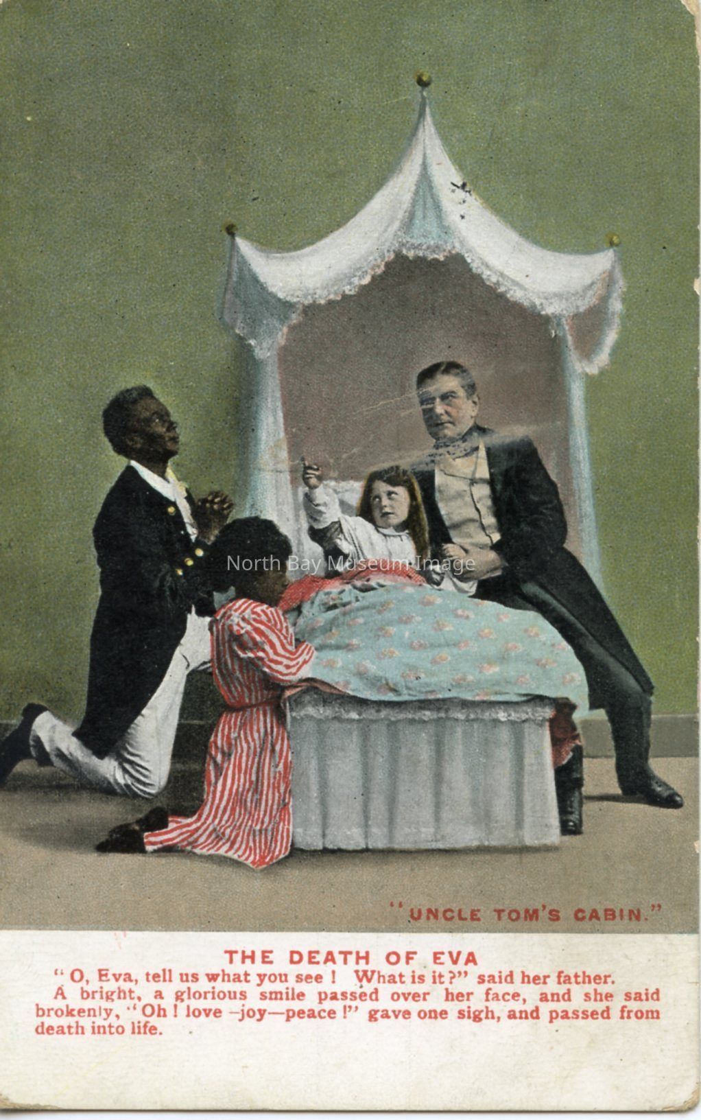 Postcard of "Uncle Tom's Cabin"- The death of Eva. The image shows a young girl laying in a bed being held and comforted by an older man, while a man and a child kneel in front of the little girl and pray.