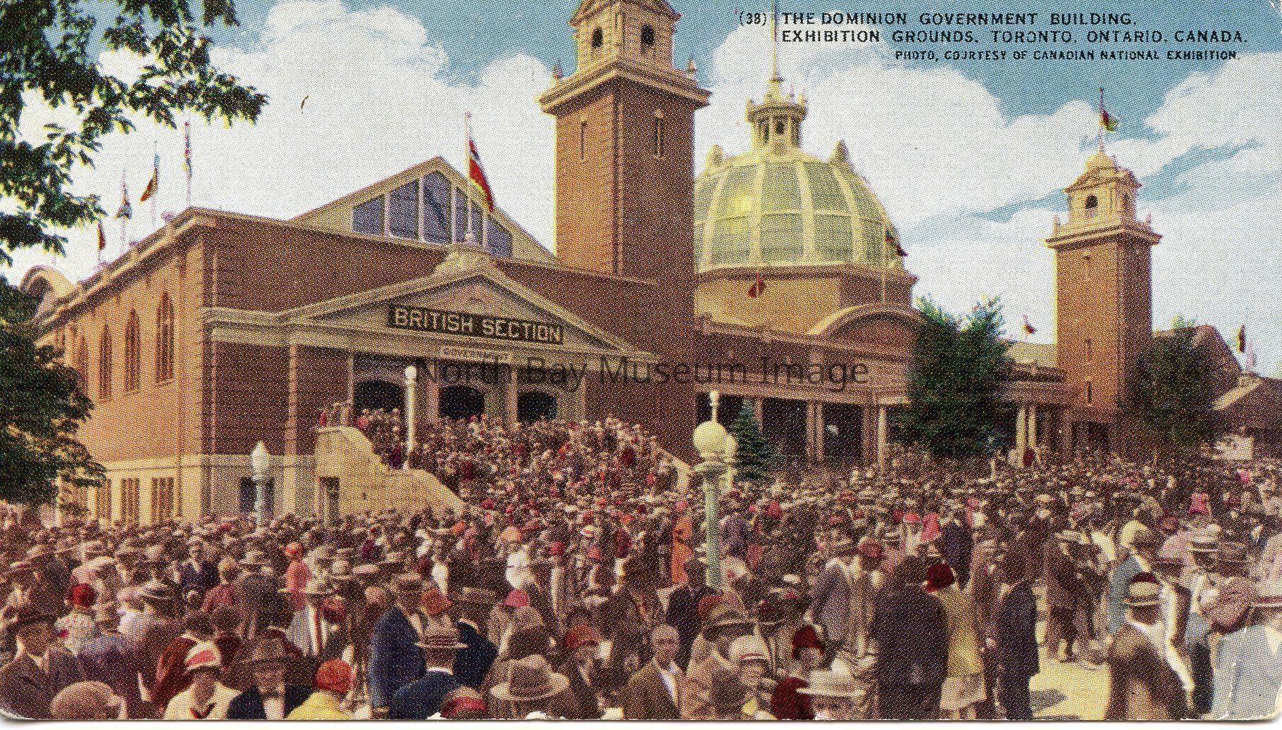 The Postcard is of The Dominion Gov't Building, Exhibition Grounds, Toronto, Ontario. The image shows a grand two storey-red brick building with a grand enterence. It says "British Section" on a sign, on the building at the left hand side. The roof at the right hand side of the postcard is a dome. Multiple flags are hung on the roof of the building. There is a large crowd of people in the photo standing both at the entrance of the building and in front of it.