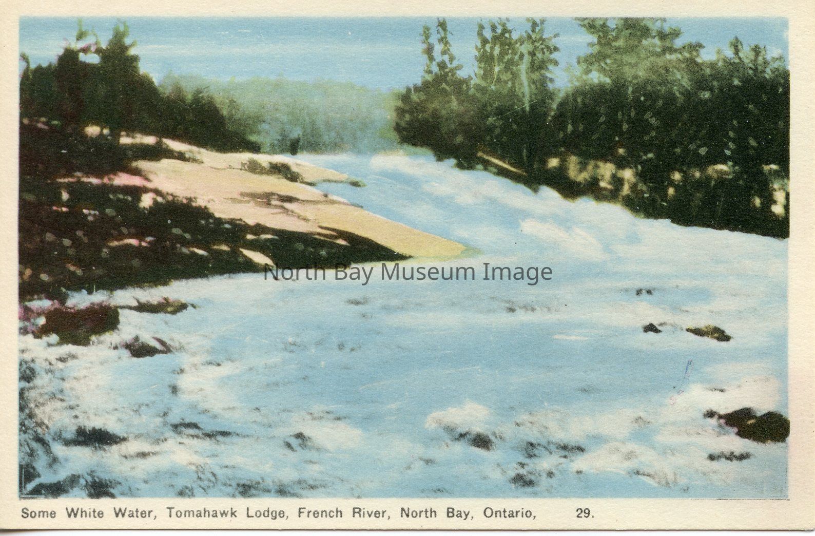 This is a coloured postcard. The image is of white water, at Tomahawk Lake, on the French River, near North Bay, on. Trees line the shoreline.