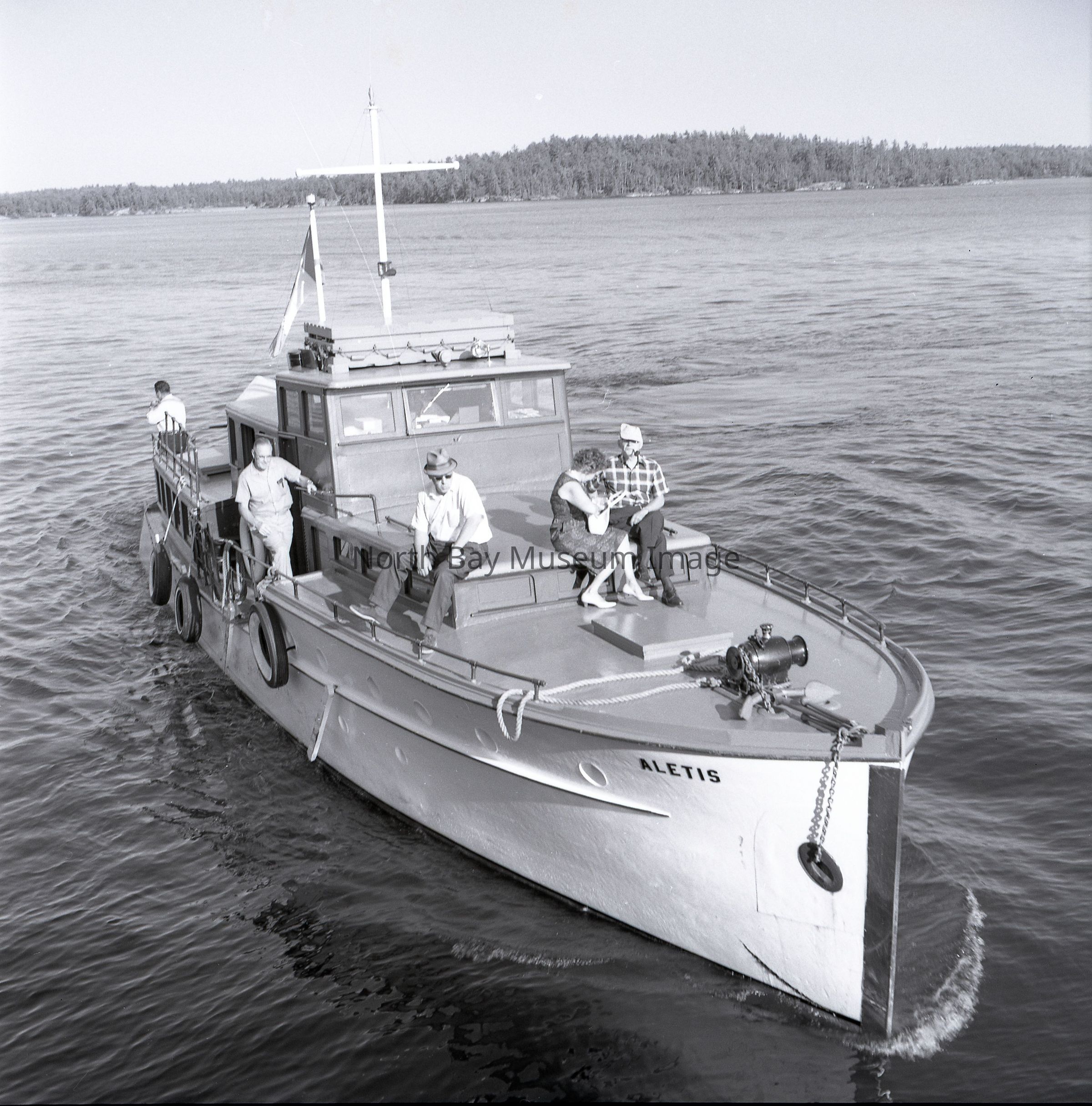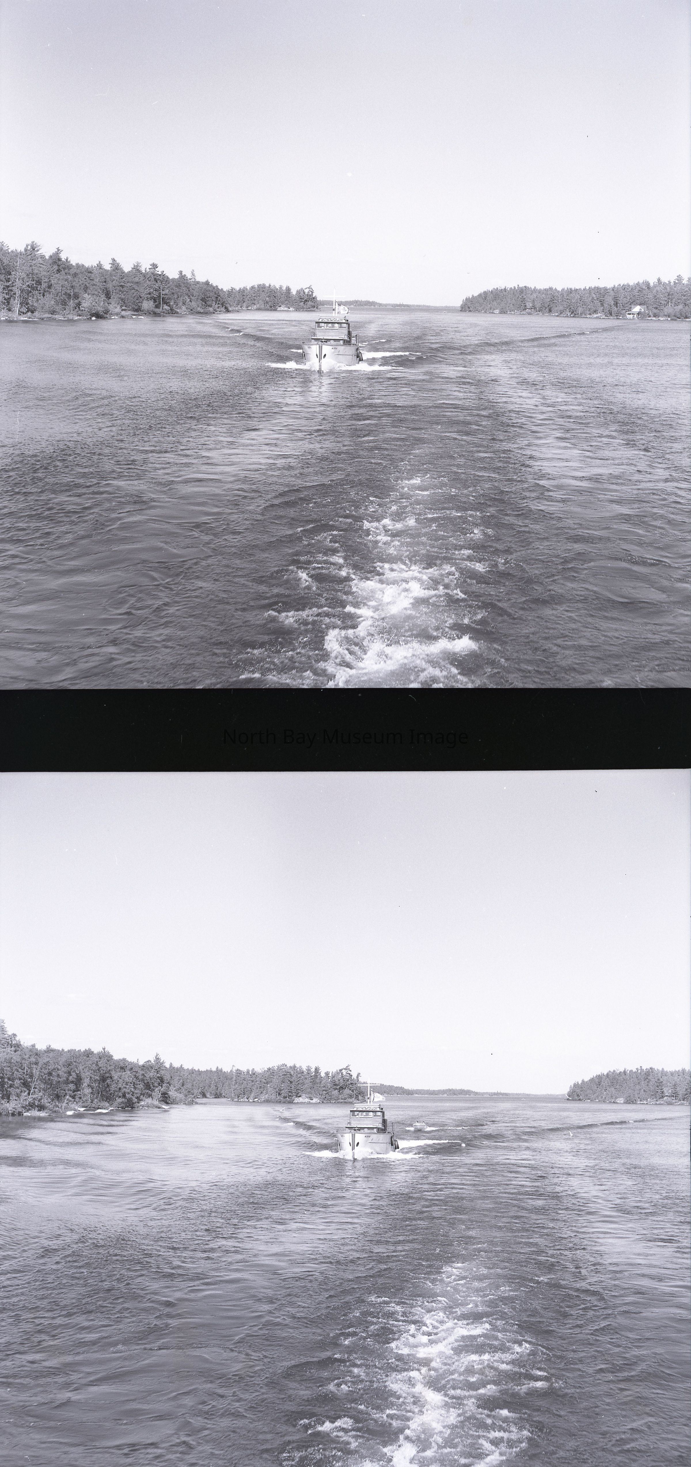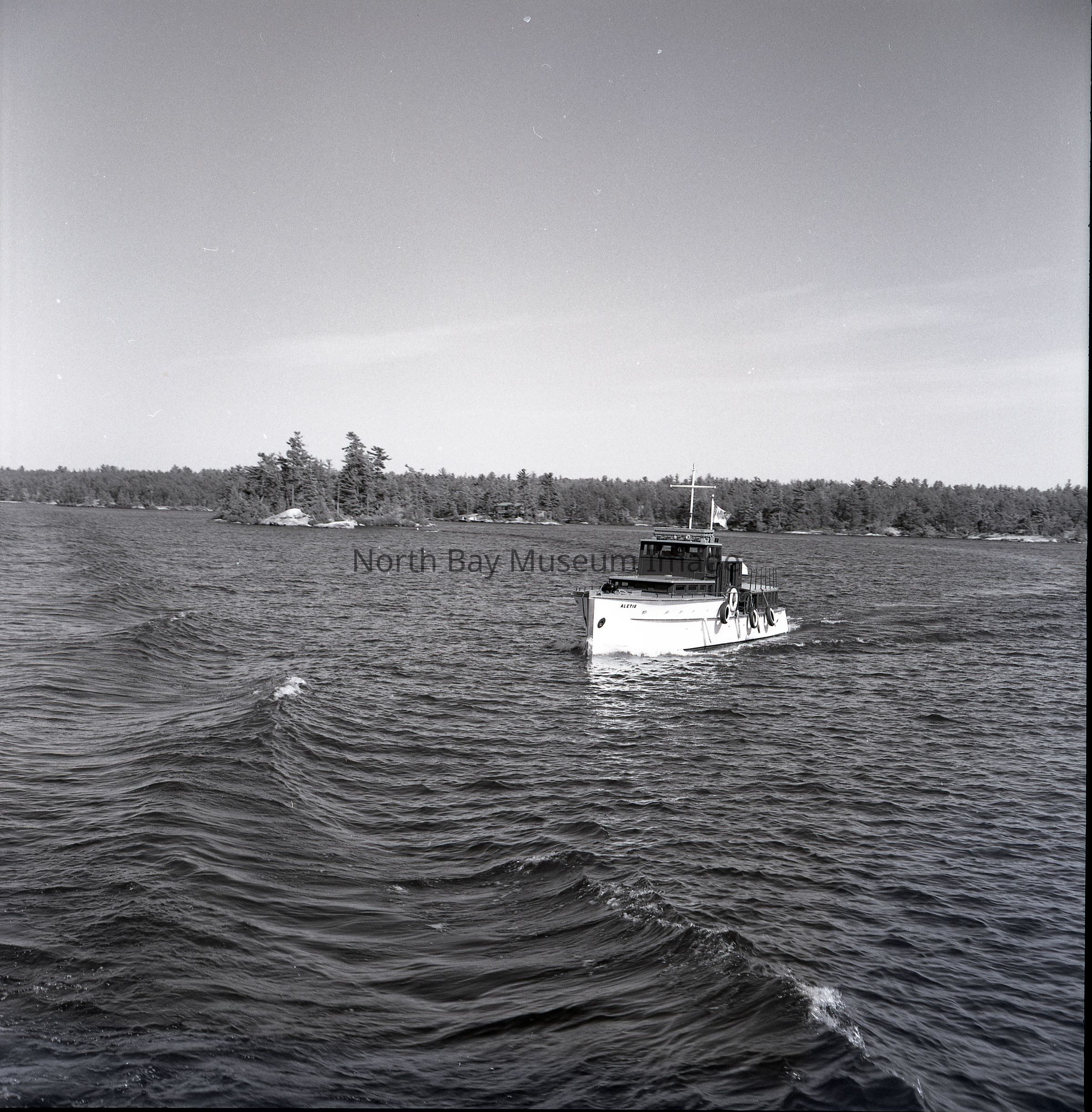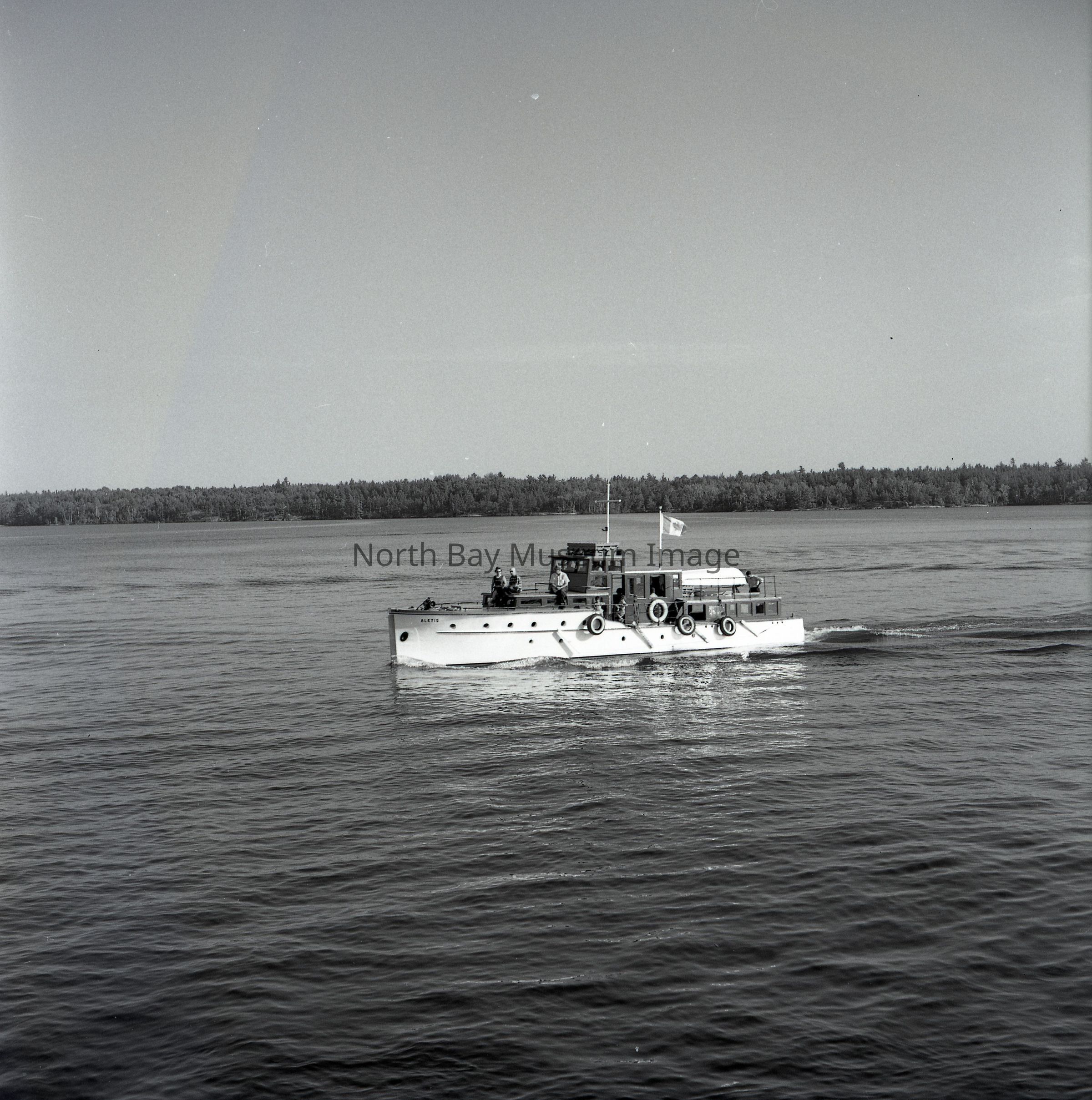 Photographers Envelopes (a-c) contains the photographs and negatives (d-n) of the French River The Aletis. The photos are taken from a boat. The images capture another boat the Aletis. Some of the images of the Aletis show that there is a small group of people on the boat enjoying the weather and sun of the day. This image is a part of the Forder Collection. List of publications for this image are listed on the front of the envelopes.Creator