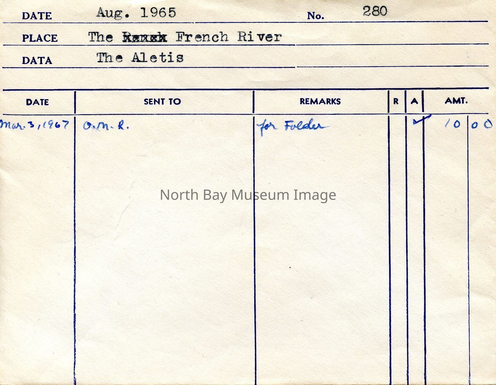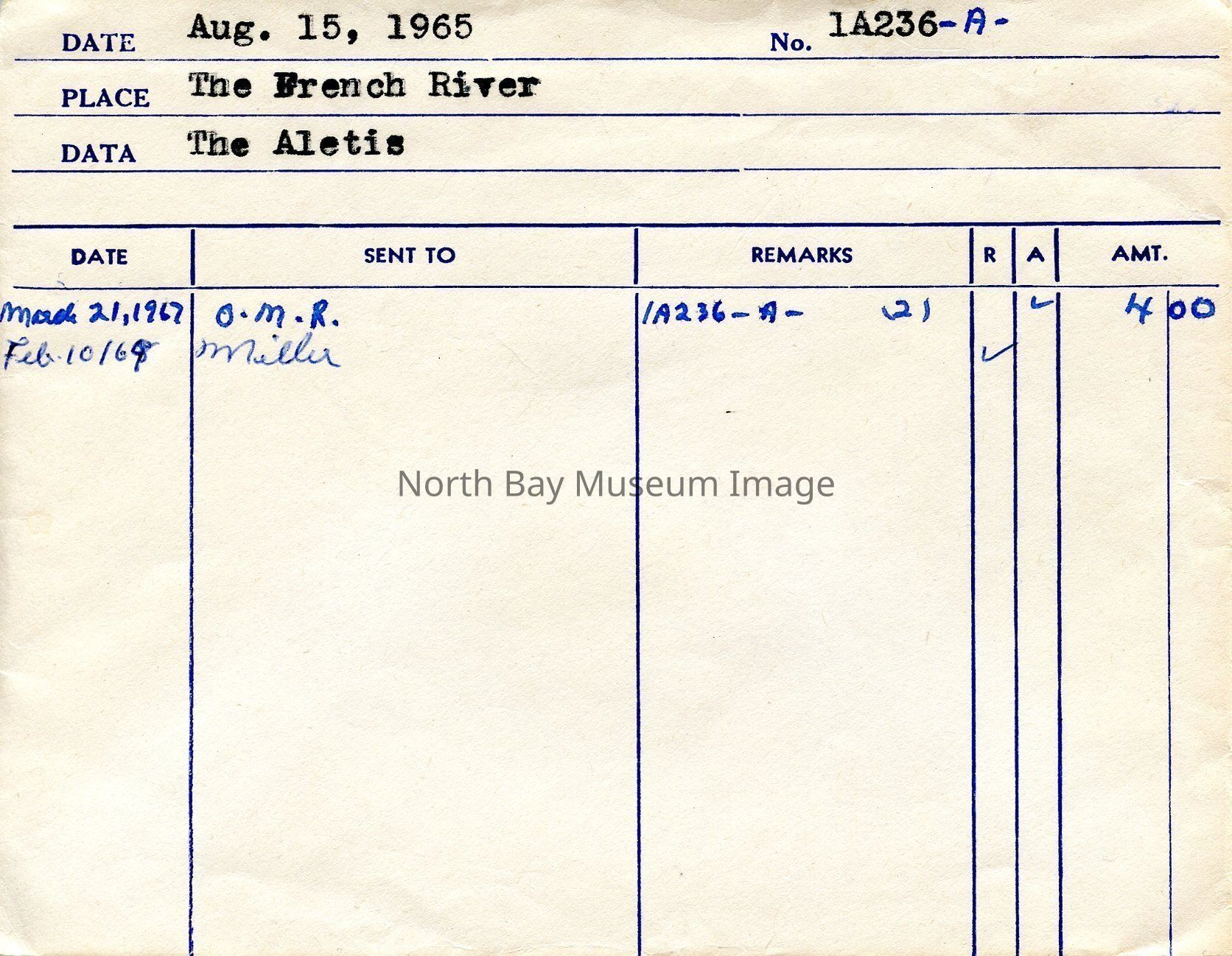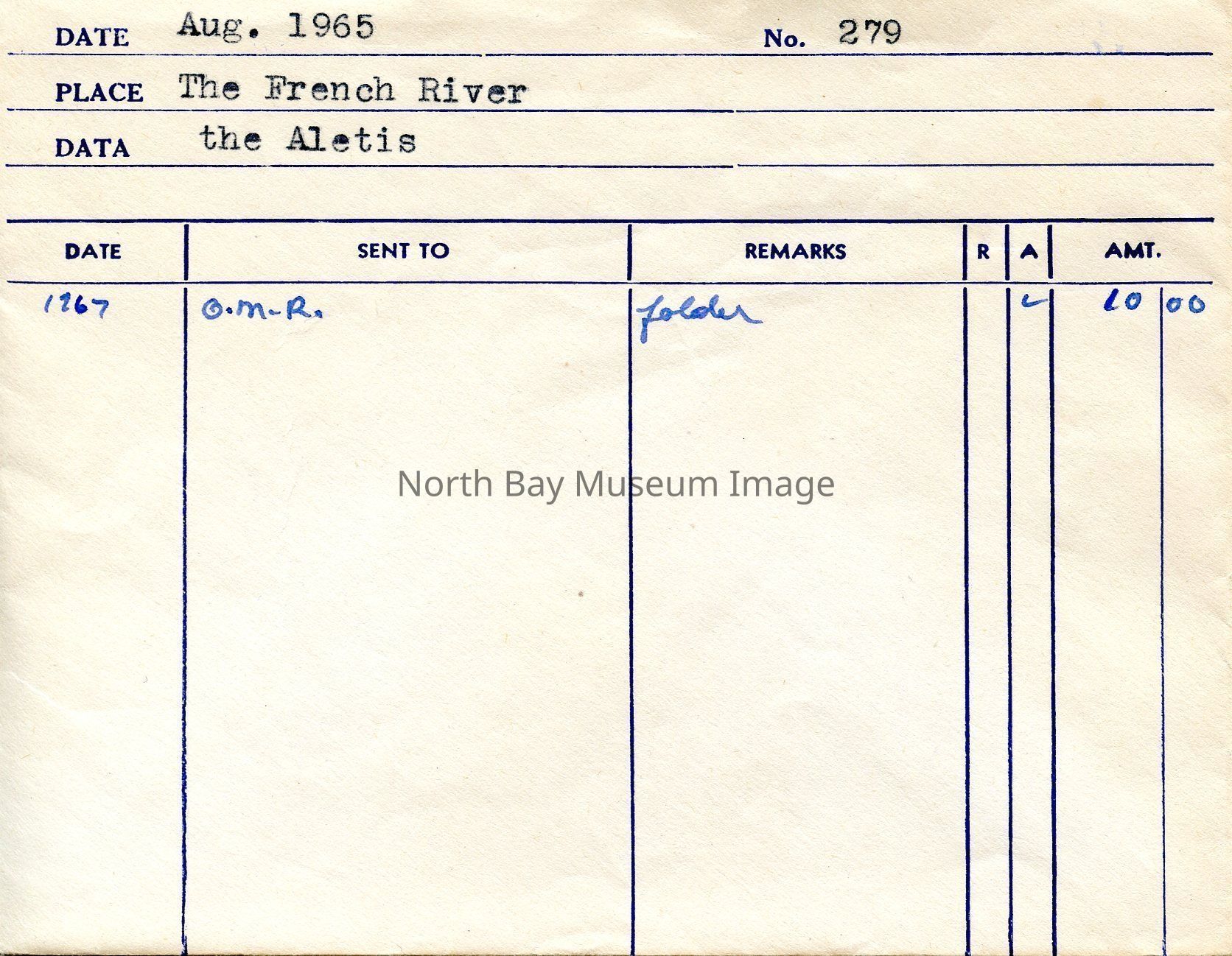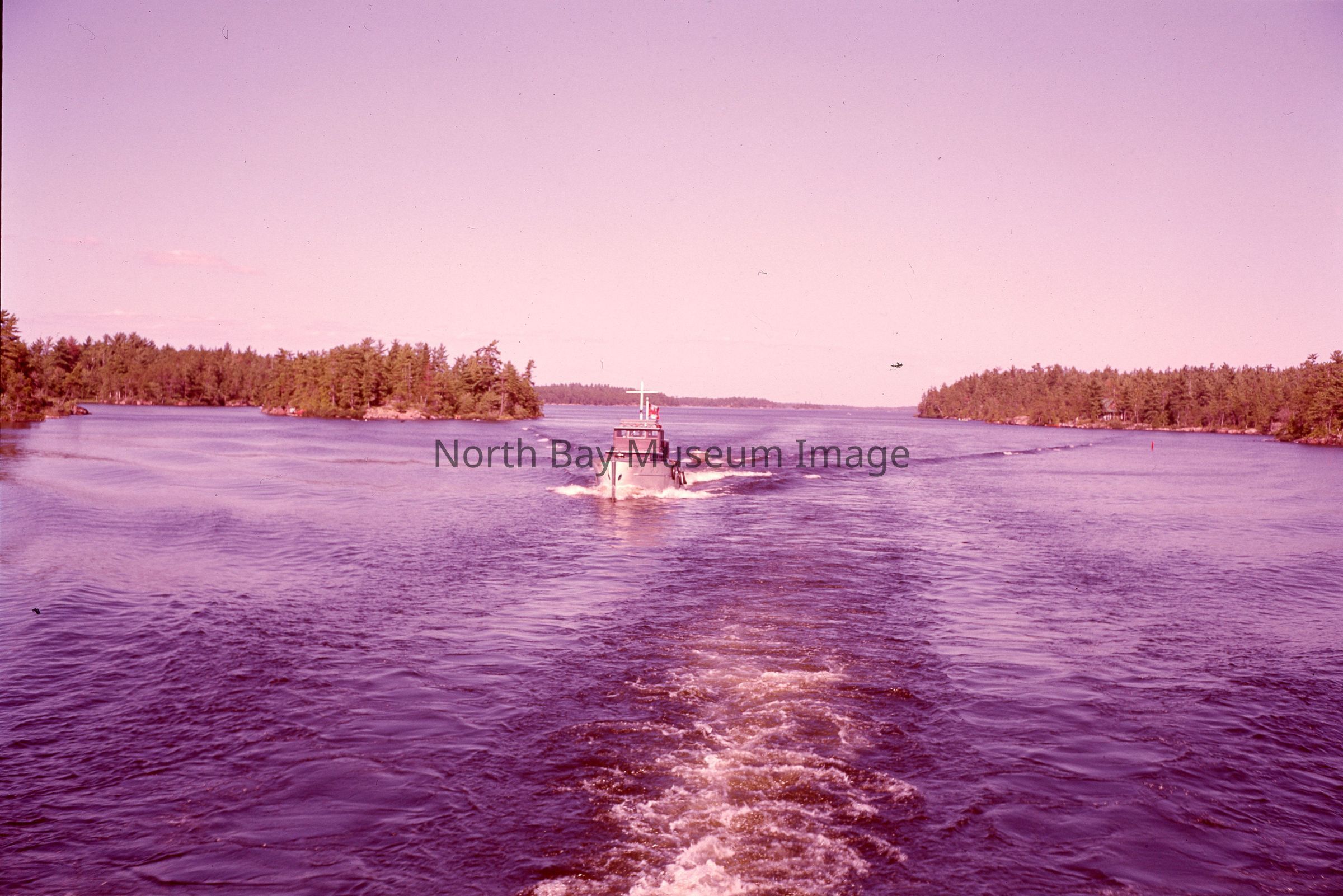 Photographers Envelopes (a-c) contains the photographs and negatives (d-n) of the French River The Aletis. The photos are taken from a boat. The images capture another boat the Aletis. Some of the images of the Aletis show that there is a small group of people on the boat enjoying the weather and sun of the day. This image is a part of the Forder Collection. List of publications for this image are listed on the front of the envelopes.Creator