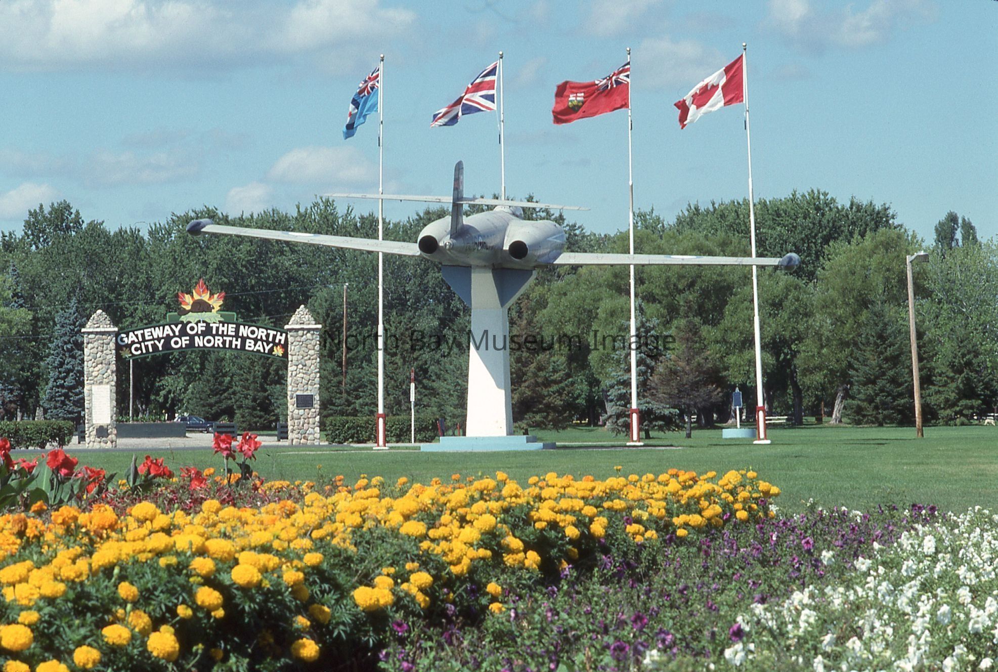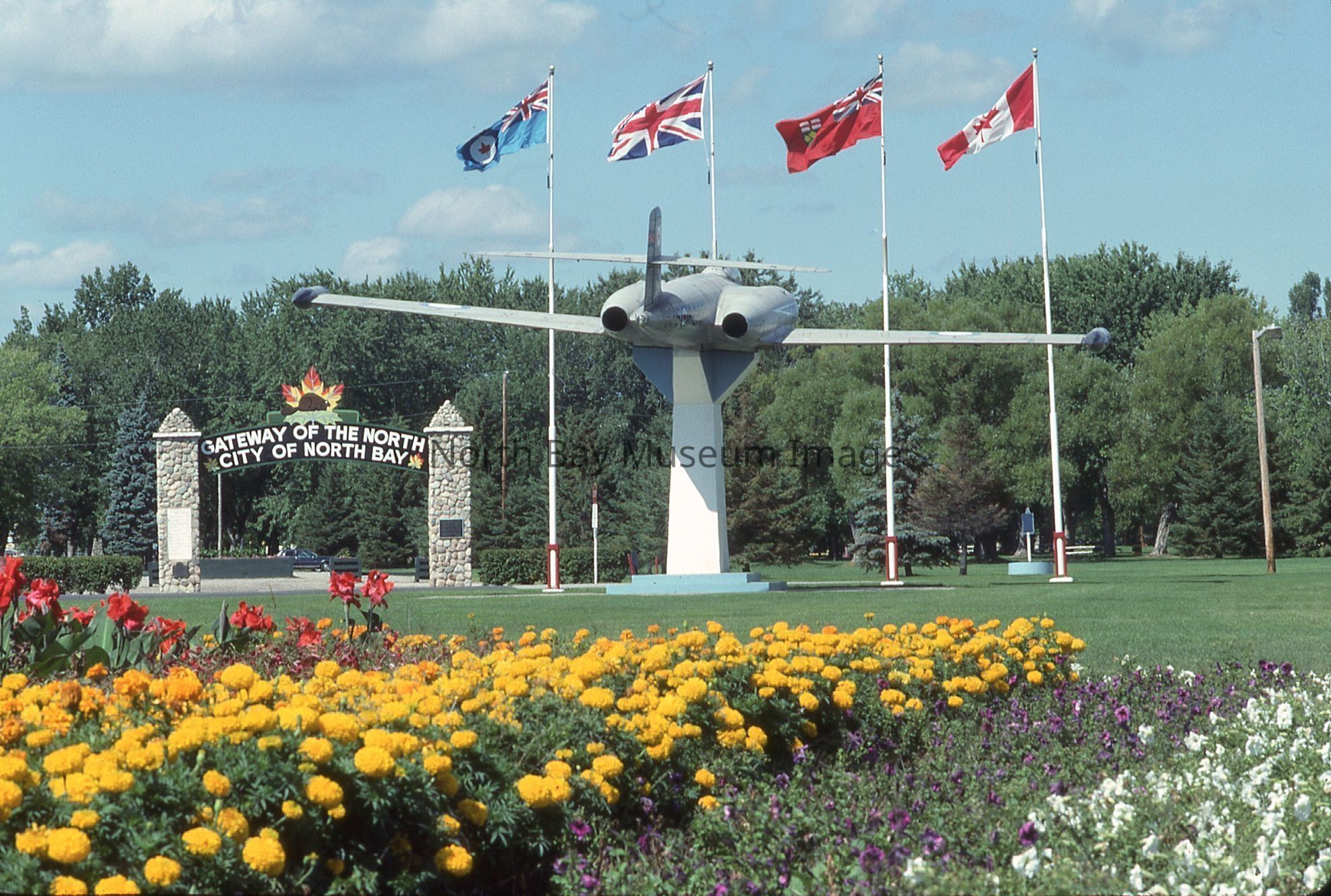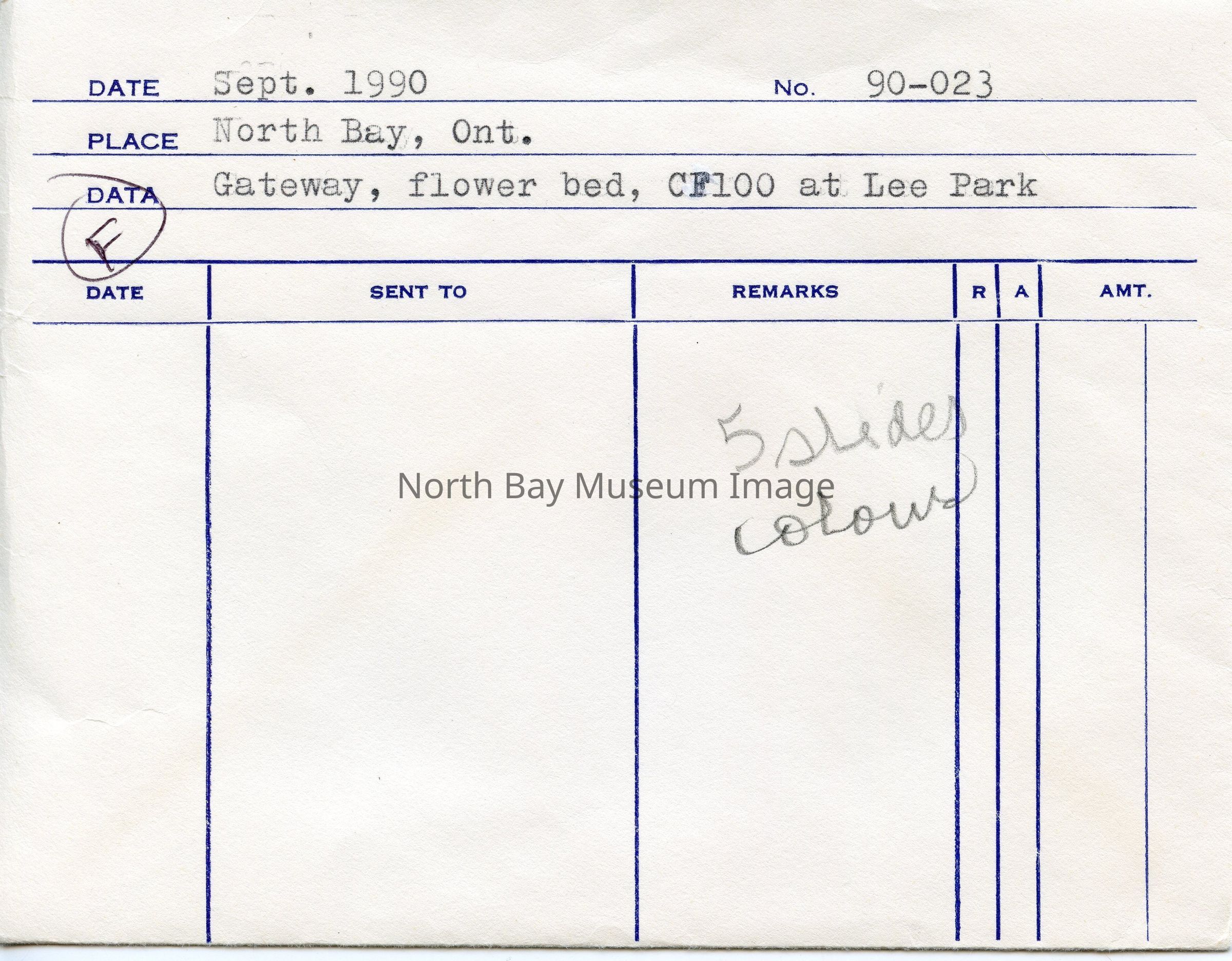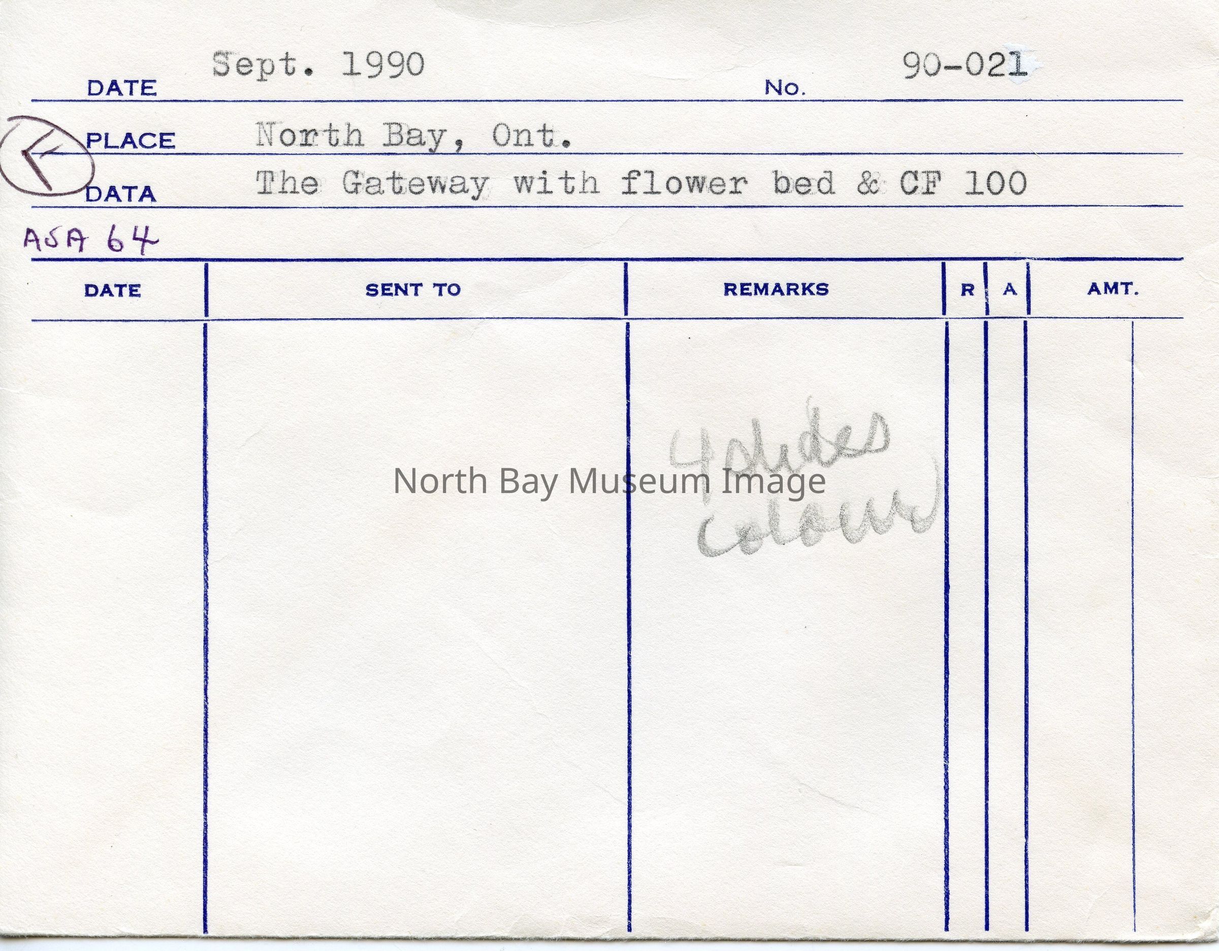 William Forder's original photographer's envelopes (a+b) with original number 90-023 and 90-021. Slides are of various views of the North Bay Gateway arch with flower beds and CF100 in view at Lee Park.Creator