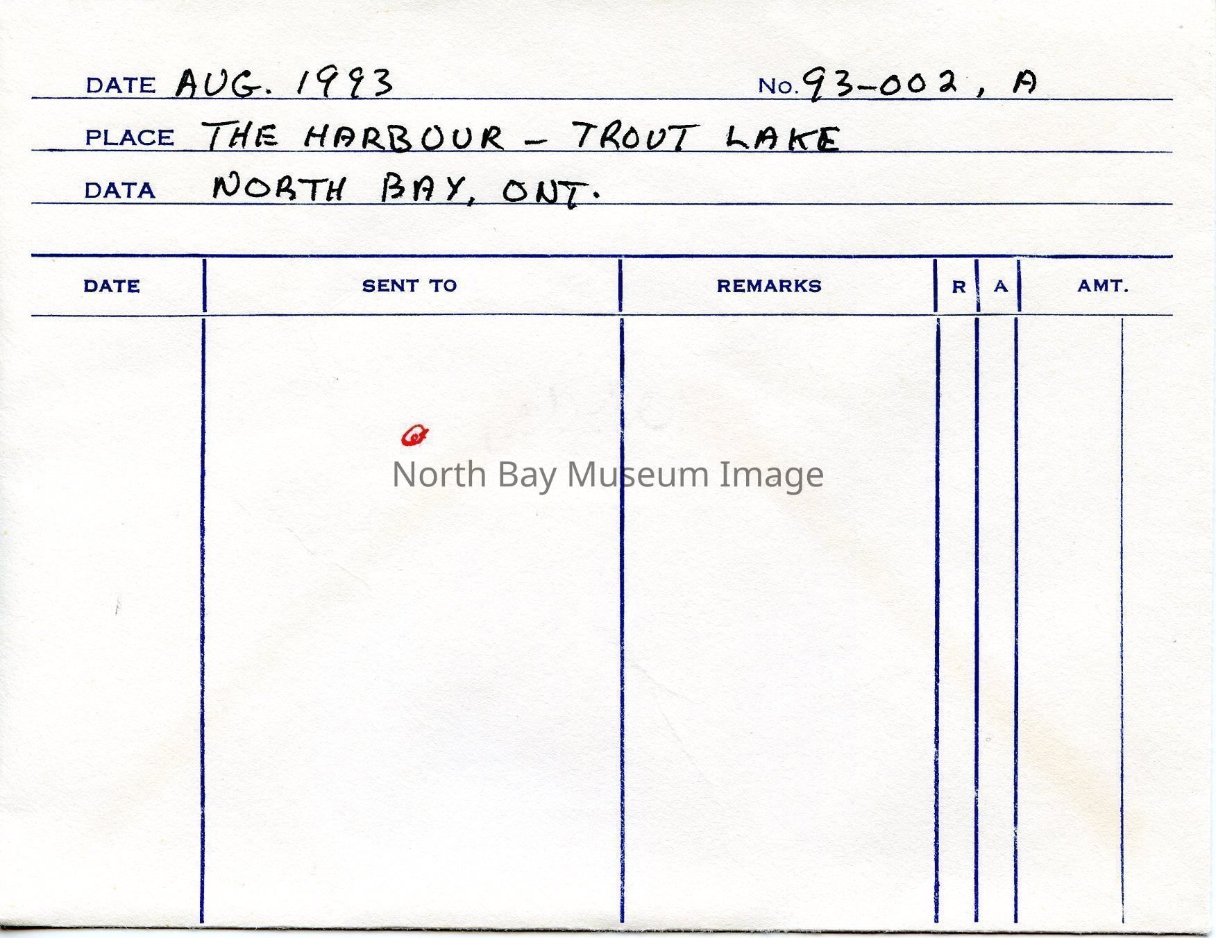 a- Original envelope from photographer WIlliam Forder identifying the photos and dates and original number 92-002,A. Dates used for publication identified on envelope. b- Slide of the harbour at Trout Lake