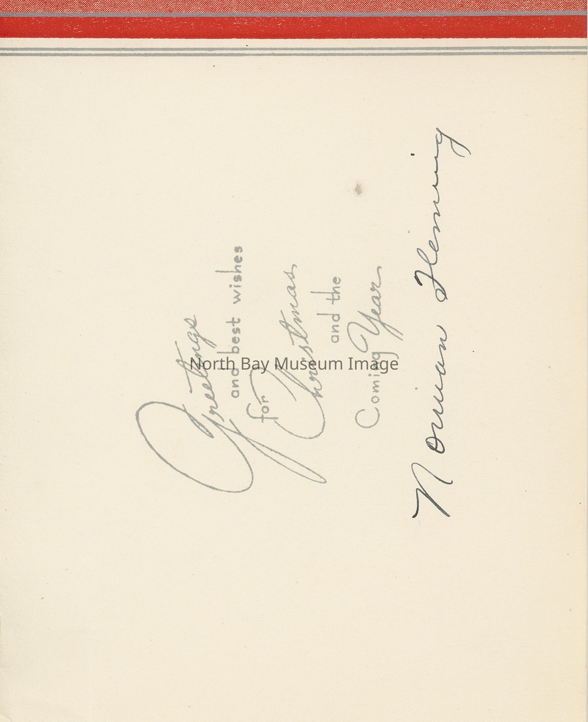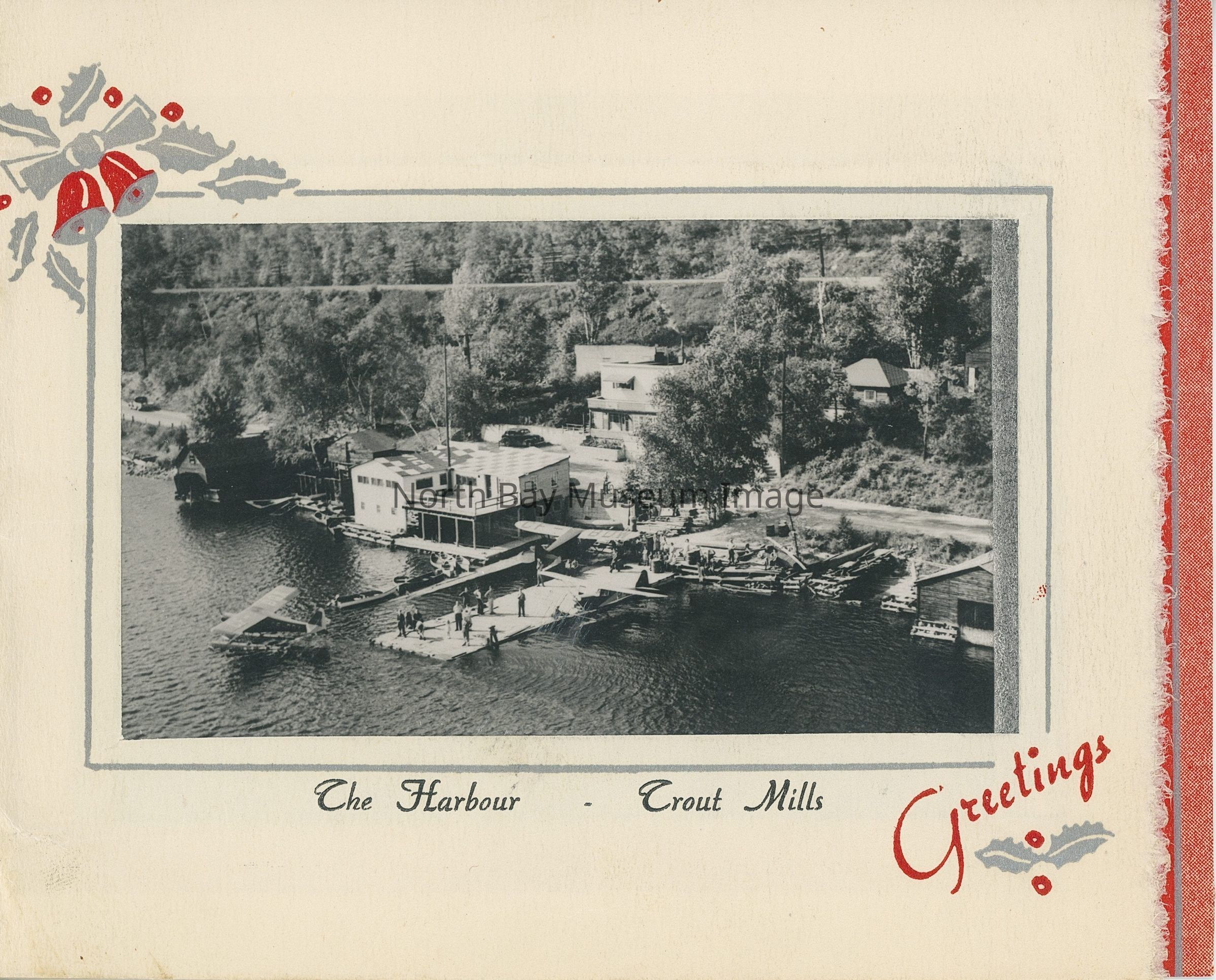 Photograph on Christmas Card featuring North Bay's original airport. The original airport was a tiny air harbour on Trout Lake, specifically at Trout Mills. Built in 1923, it handled flying boats—airplanes with boat-shaped hulls, which took off and landed on water. Because they could take off and land on rivers, lakes and the sea, the flying boats were used heavily by the Canadian and provincial governments and commercial companies to explore and map the country, and move passengers and cargo throughout Canada. The police used them for things like fisheries patrols and to intercept smugglers, and the air force flew the flying boats during their defence of the country and in search-and-rescue and mercy flights. The air harbour was set up on Trout Lake since North Bay was, and still is, the crossroads of Canada--flying boats regularly stopped at the harbour during flights to the north, south, east and west of the country. Information provided by Captain Doug Newman.Creator