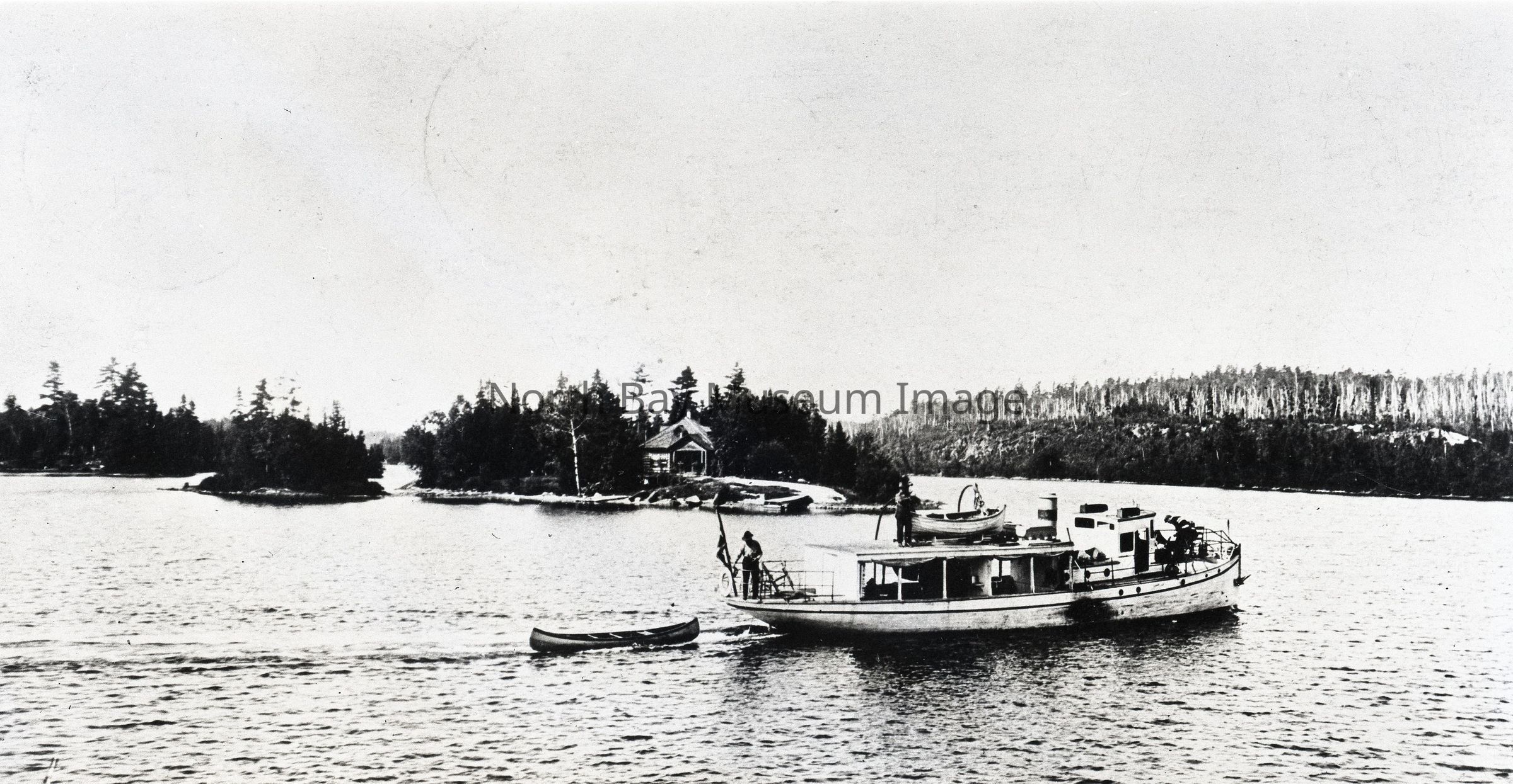 Negative (a) of the Keego Chief Fire Ranger's Island in Temagami. The image shows a man on a boat with a canoe trailing behind on the lake. In the background you can see a small cabin on an island. A part of the Forder Collection.Creator