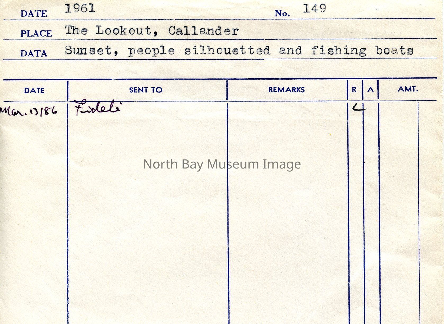 Photographer's envelope (a) contains a slide (b) of The lookout at Callander. The imgae captures the sunset at the Look Out. In the image there are peoples silhouettes captured, as well as, fishing boats. Publications of the photo are listed on the back of the envelope.This image is a part of the Forder Collection.Creator