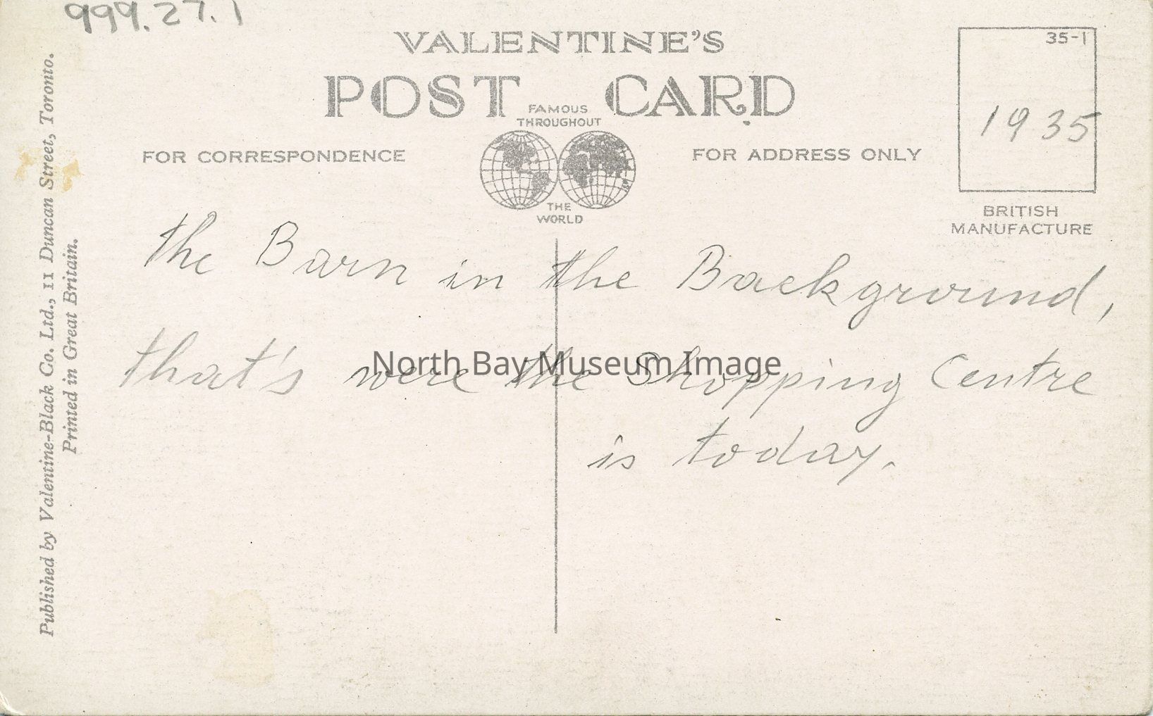 On back is written in black ink is the message, "The Barn in the background, that's where the shopping center is today.Creator