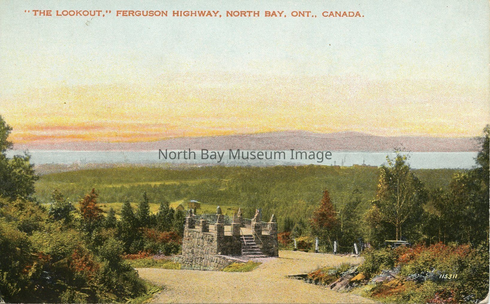 This is a coloured, picture postcard. The postcard is depicting the lookout . The lookout is stone made with steps and a yellow road leading to it. In the postcard you can see the sunset over Lake Nipissing in background. Thre is red writing on top left corner.