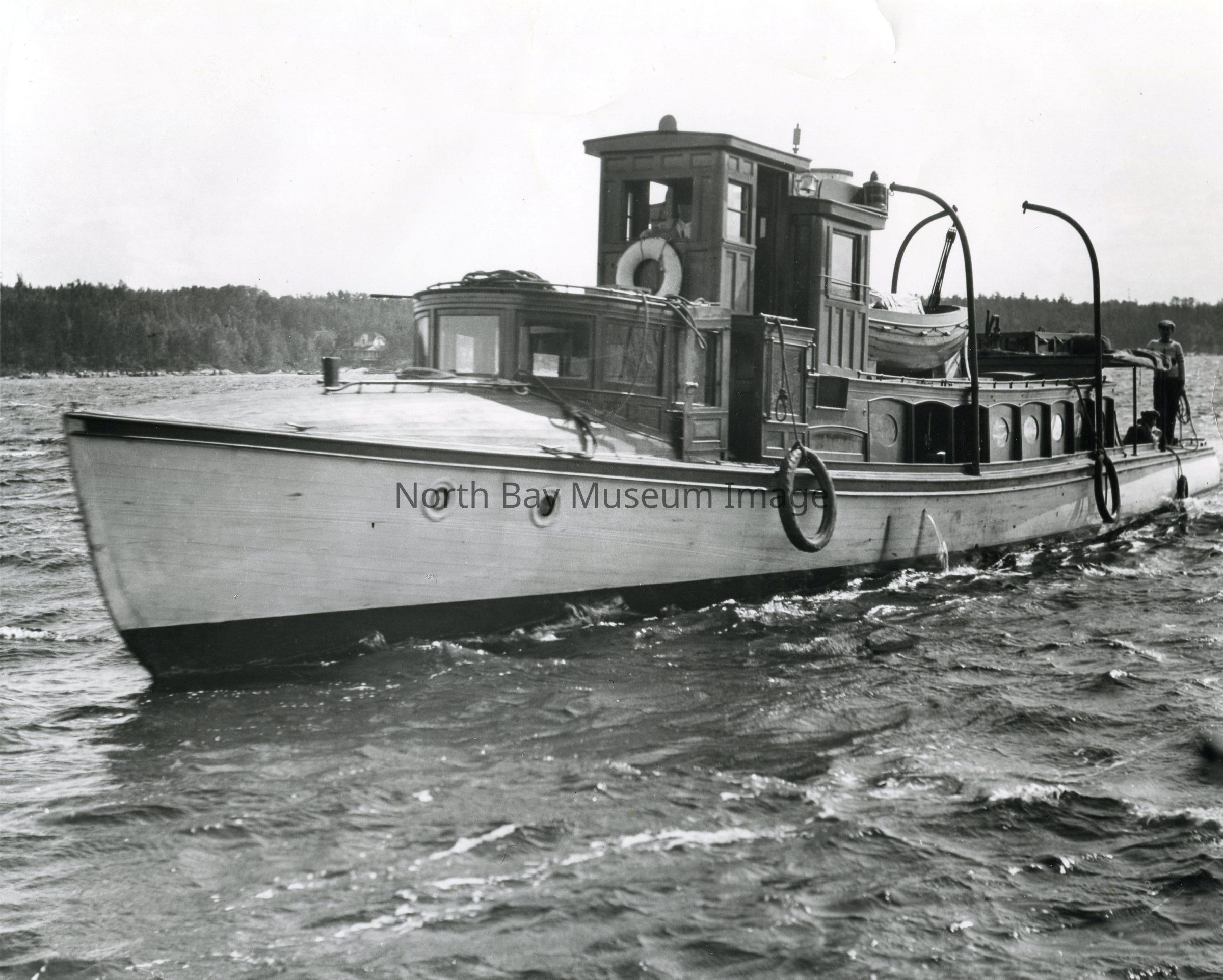 Black and white photographic print of the boat "Miami Beach" -travelling on the lake -people standing on the deck of the boat -diesel powered boat