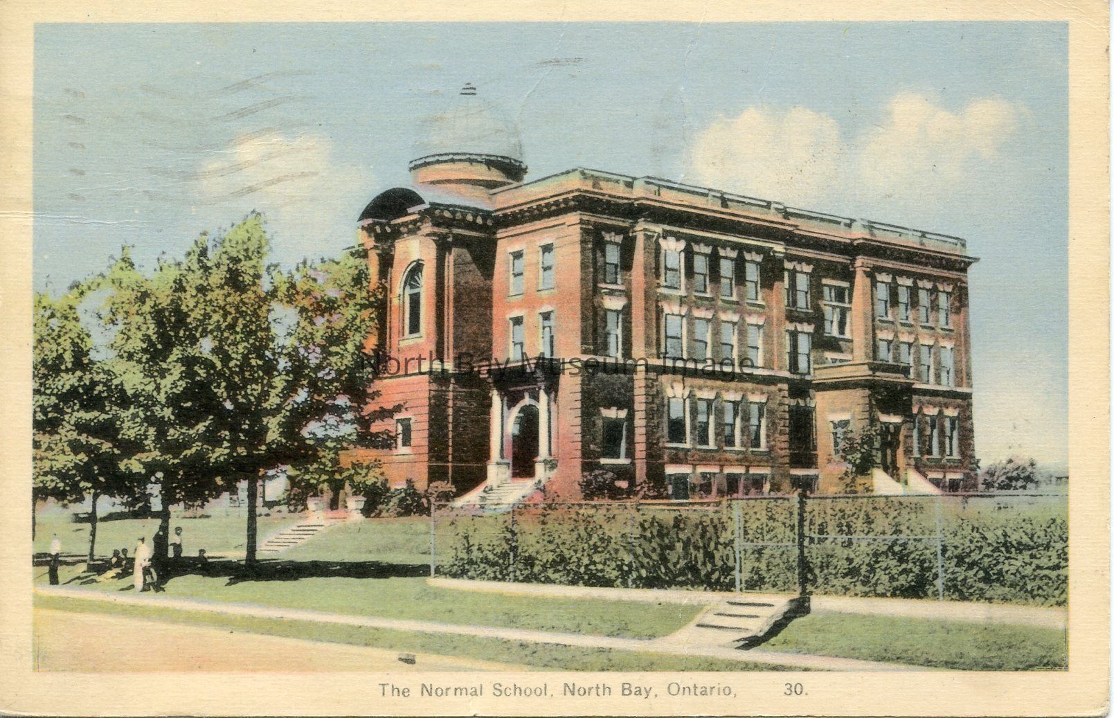 This is a coloured photo of the North Bay Normal School. The school is a 4 storey brick building. The school has a roof supports a dome shaped observatory and has a railing all around it. The building has many windows along the side.The front of the building has an upper arched window with a canopy roof over it, and is supported by two brick columns that are supported by a solid brick wall with a small window. The small overhead roof has the support of two white columns. There are six or seven cement steps leading up to the door. Another addition appears on the side of the building with steps leading up to it. There is a wire fence across the front with a gate and steps leading up to it. The building has many bushes growing along its side. The image shows that there are three trees shade lawn where several people are gathered.