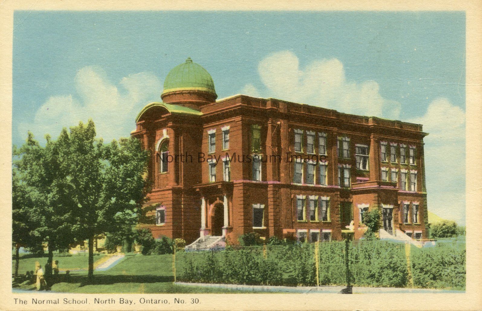 A coloured postcard of the North Bay Normal School. The postcard shows the side of the Normal School. There is a dome on top of building with pillars reaching the roof. The windows are evident around building. The building entrances are at the front and side of the Normal School. There are also trees and grass surrouding the building. The area with the shrubs was used for physical education classes.