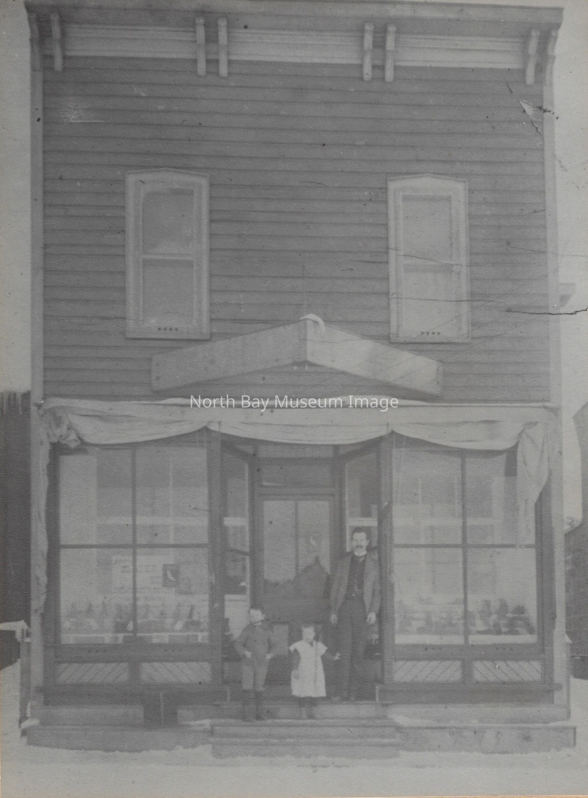 Matted image showing family standing out in front of the original Deegan's shoe store which opened in 1889 on Main Street West.