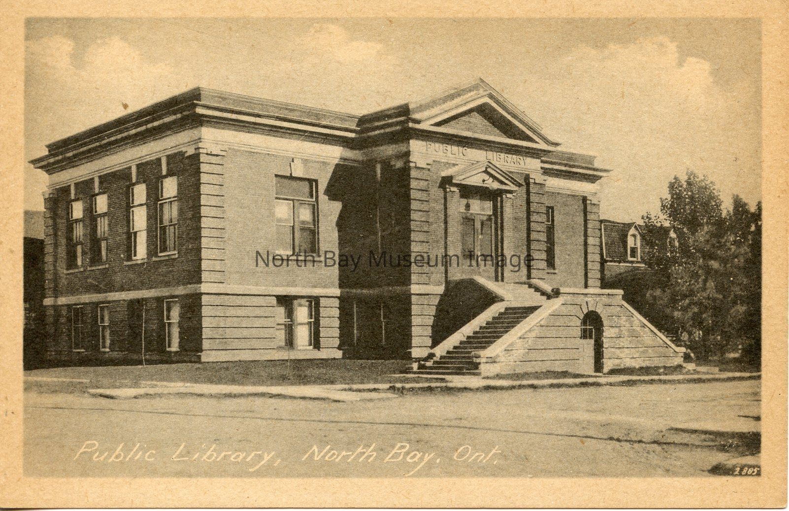 This is a Black and white post card of the PUBLIC LIBRARY in North Bay, Ont. This building was demolished 1970's. Today it is now site of City Hall Council Chambers on McIntyre and Wyld St.