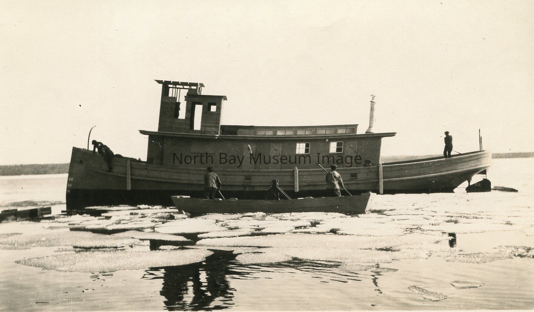 Photo is of the tug boat "The Screamer" and there is still ice floating in the lake