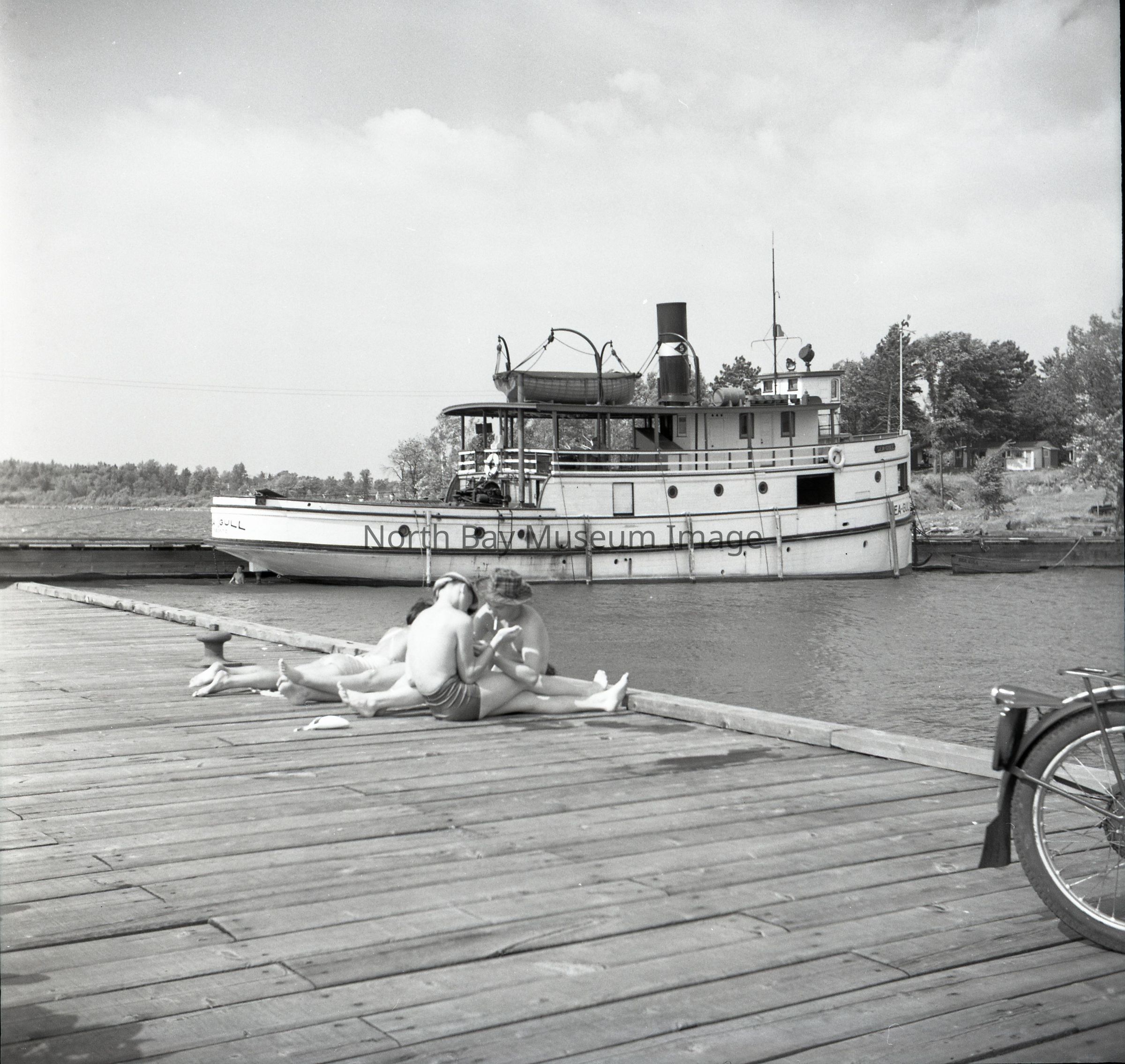 Photographer's Envelope (a) contains the photo and negative (b-c) of the Seagull. The image shows the boat on the background docked. There are also numerous sun bathers on the dock enjoying themselves. The Seagull would be scraped in 1962, being over 80 years old. The photographers original accession number is 1A56 for these images. This image is a part of the Forder Collection. The Publication dates and information for these images is listed on the envelope.Creator