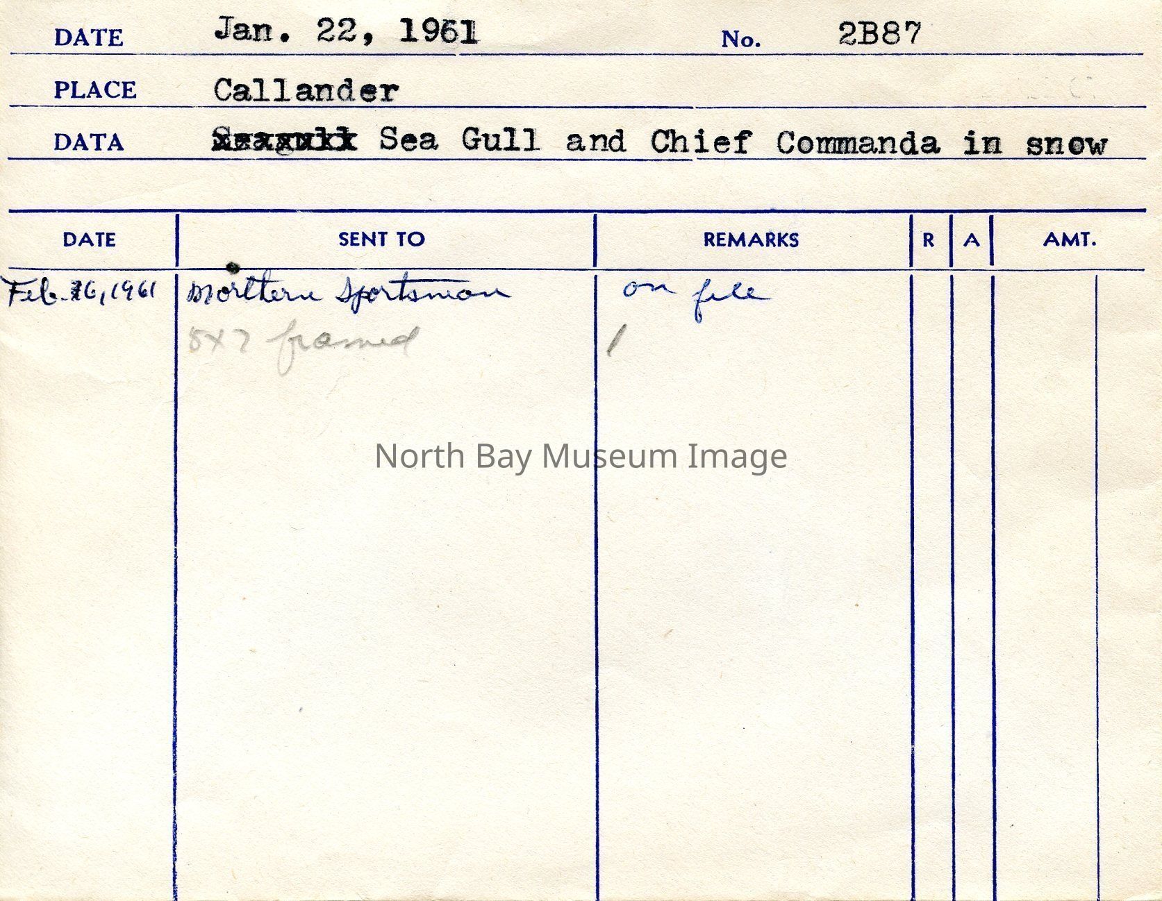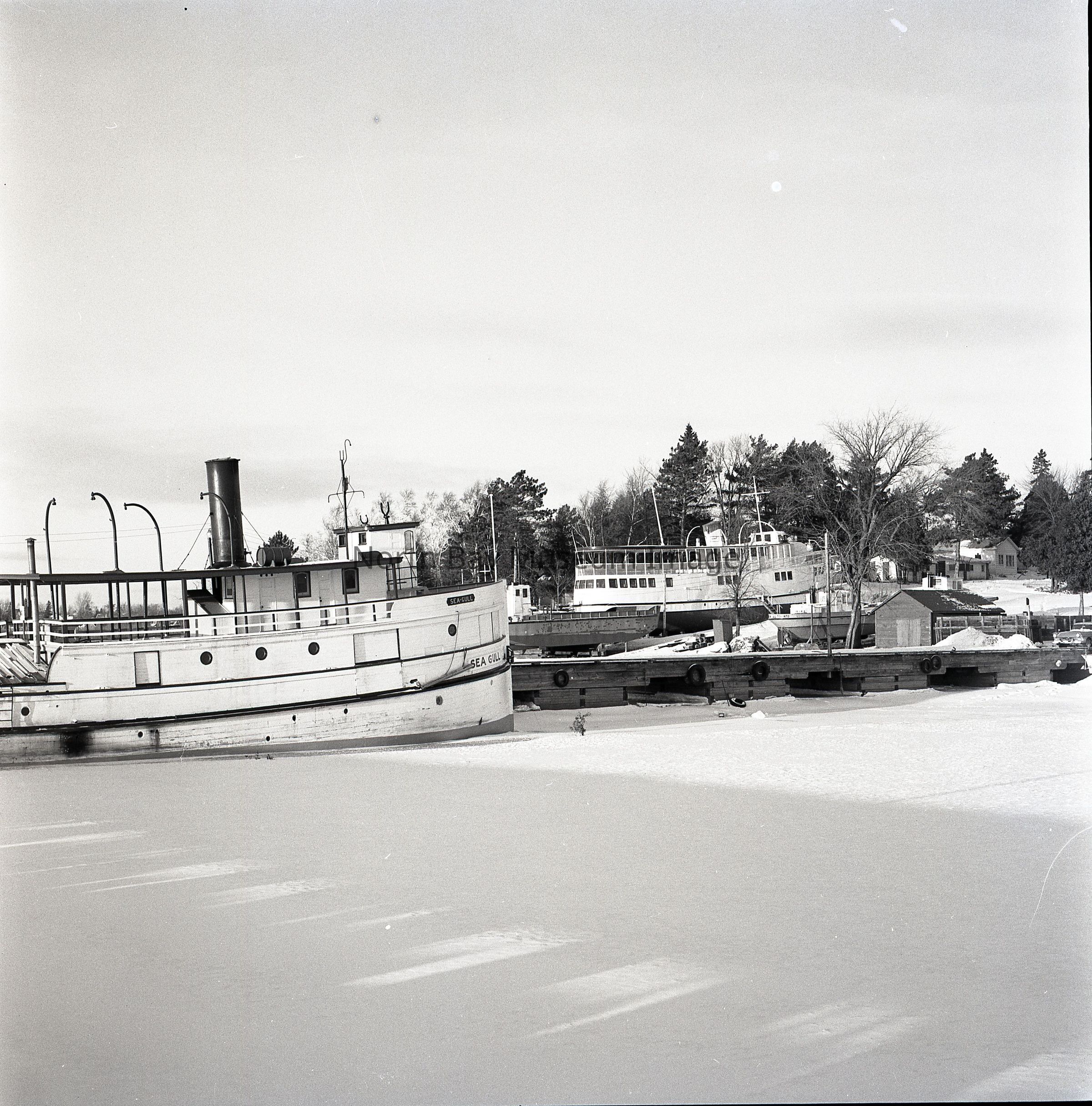 Photographer's Envelope (a) contains the photo and negative (b-c) of the Seagull and Chief Commanda in Snow. The image shows the seagull in the foreground of the picture and then the Chief Commanda in the distance docked and covered in snow. There also appears to be other little boats docked beside the boats. The photographers original accession number is 2B87 for these images. This image is a part of the Forder Collection. The Publication dates and information for these images is listed on the envelope.Creator
