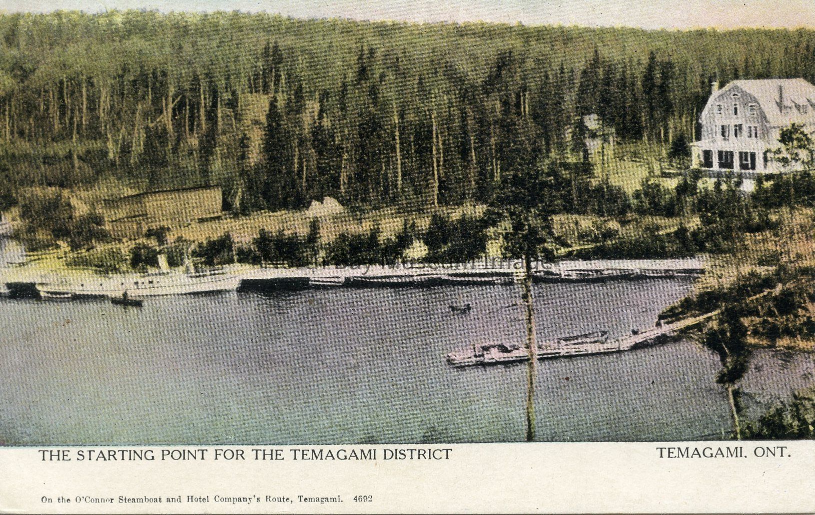 This is a colourized Postcard of Temagami, Ontario. The words "The Starting Point for the Temagami District", "Temagami, Ont.", and "On the O'Connor Steamboat and Hotel Company's Route, Temagami, 4692" are printed along the bottom of the card. The image shows a curving waterfront view. A home appears in the right hand side of the postcard.