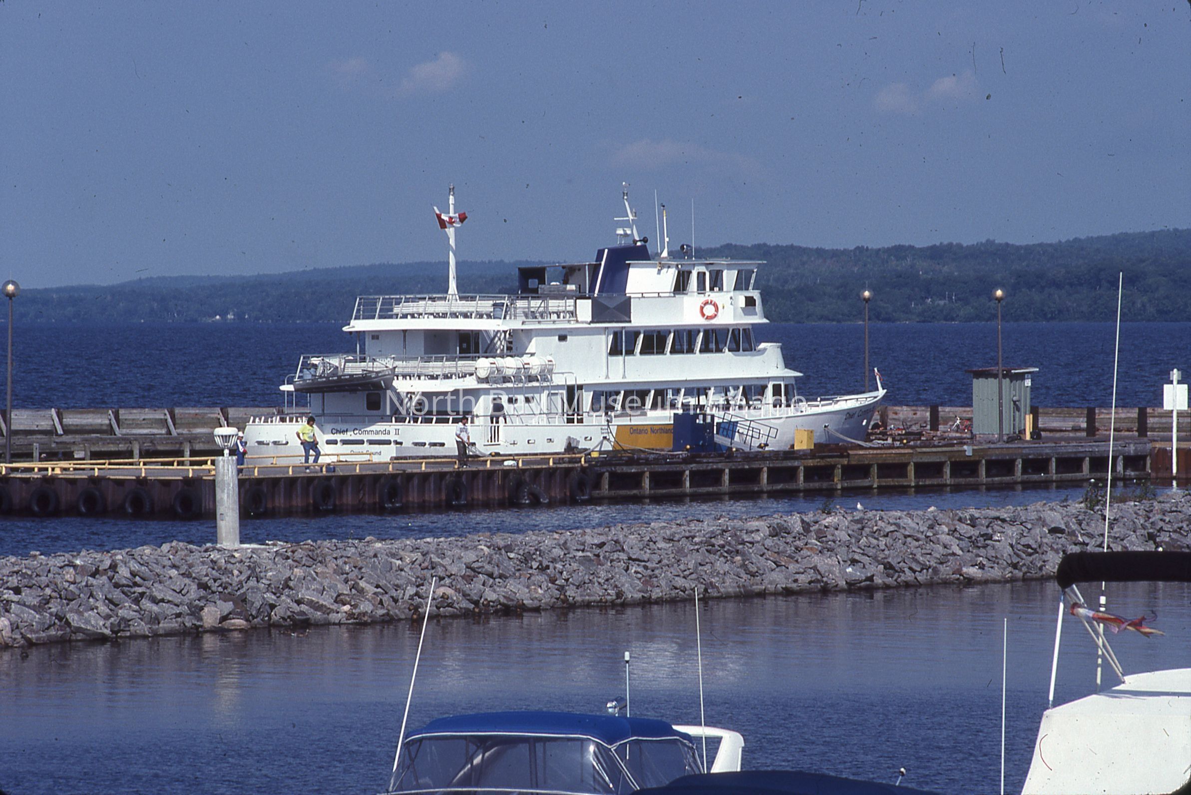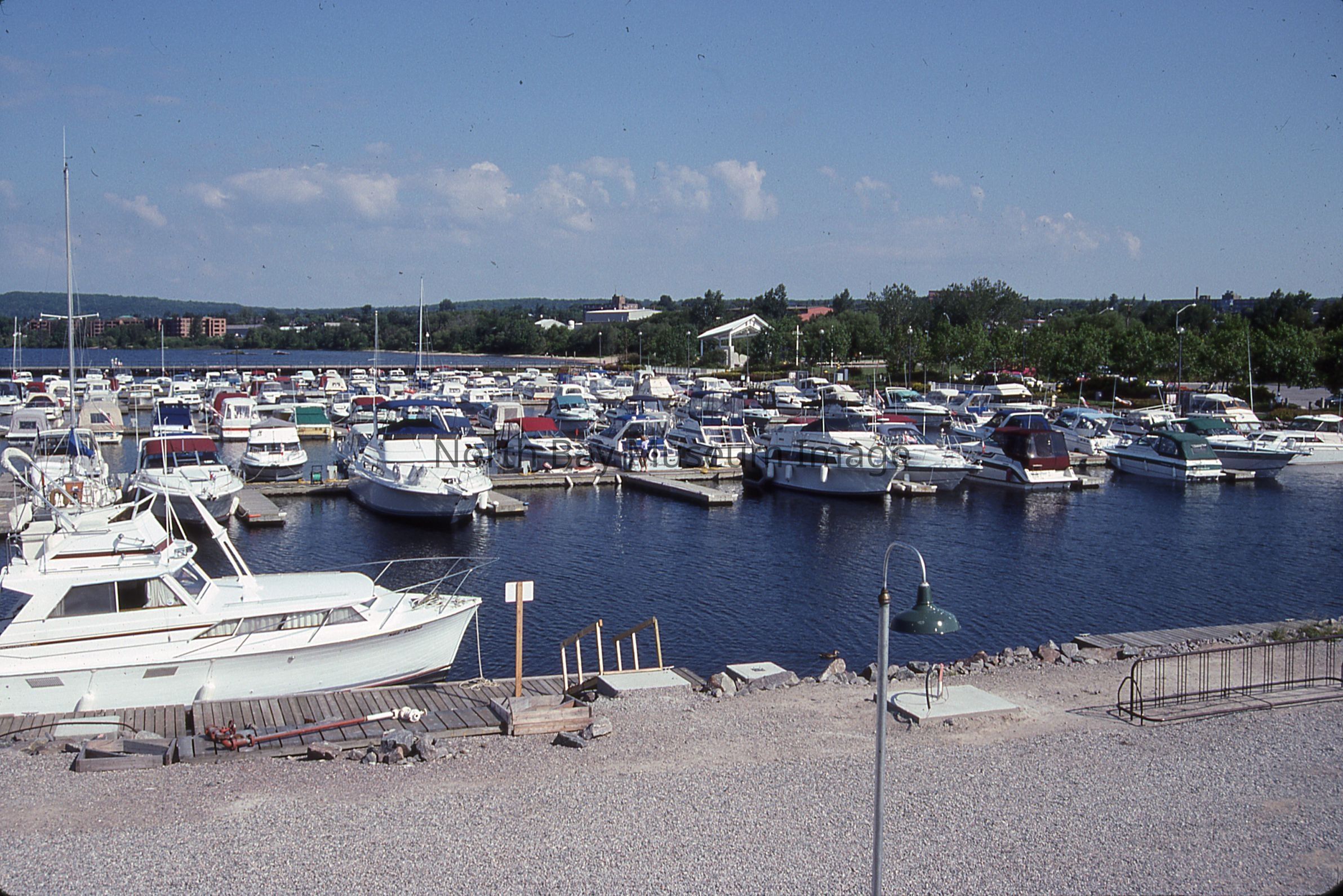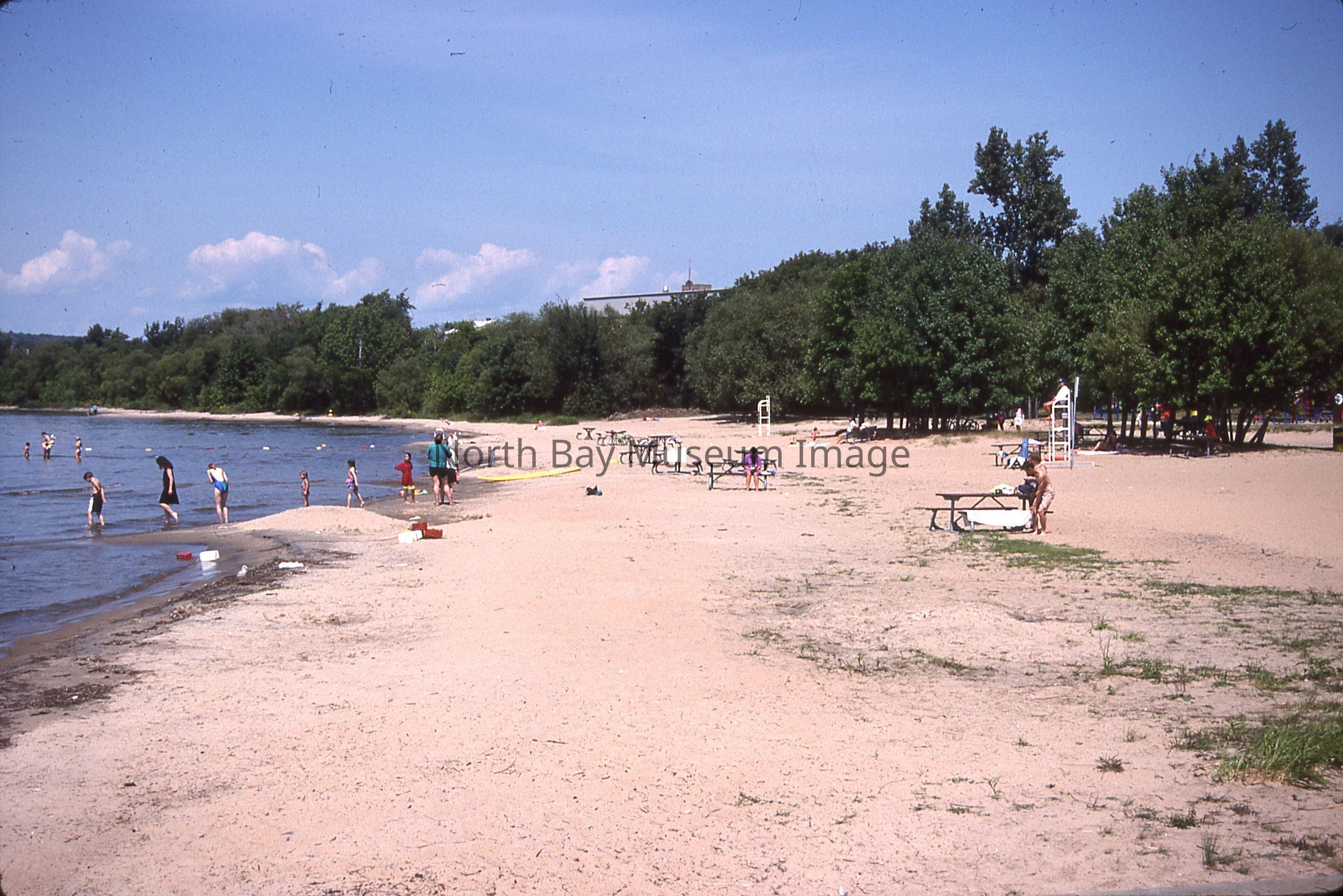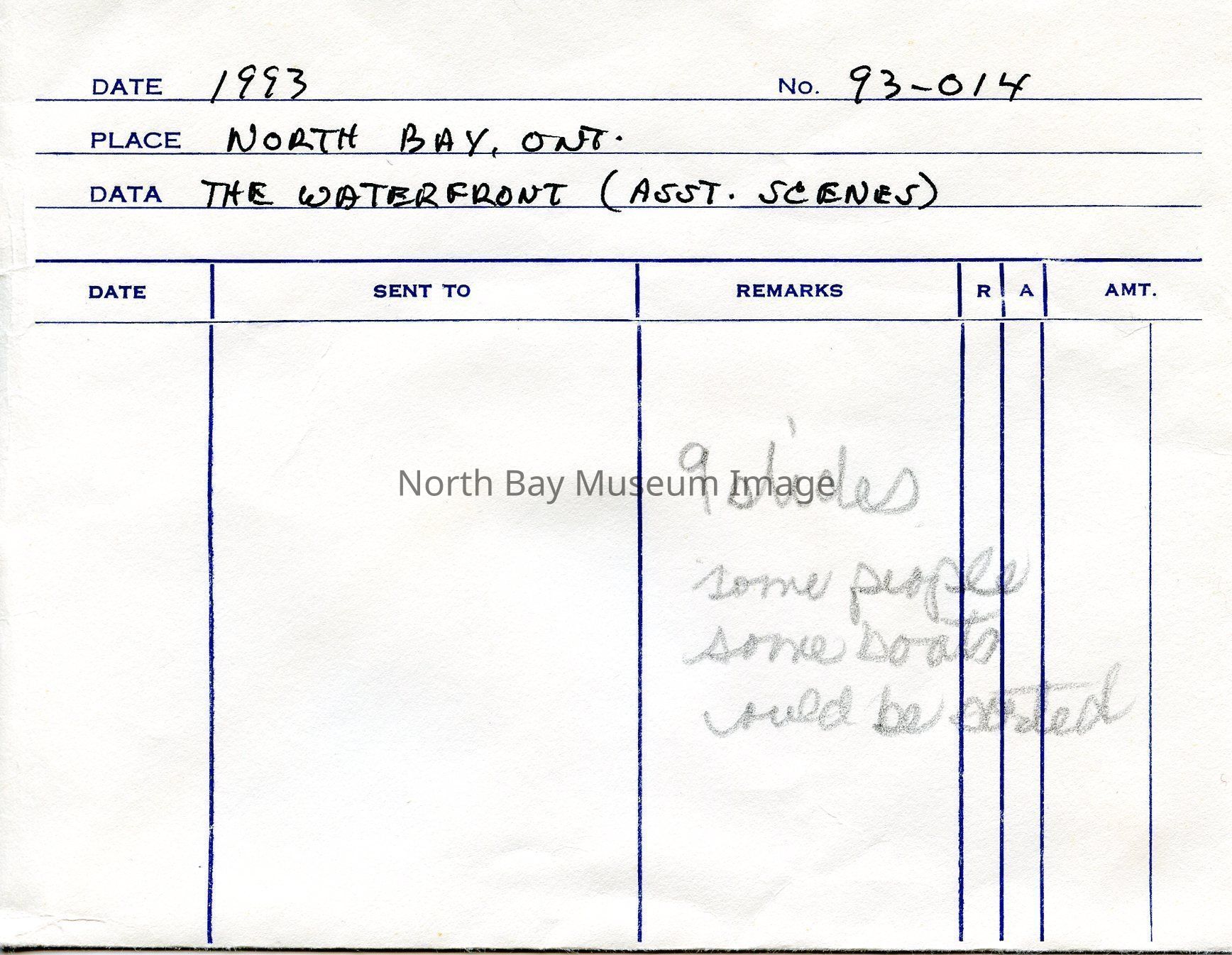 Envelope (a) containing slides (b-j) of North Bay waterfront and asst. scenes. Photos consist of images on the waterfront of boats, people walking along the waterfront, as well as image of the beach.Photographer William Forder's original number was 93-014.Creator