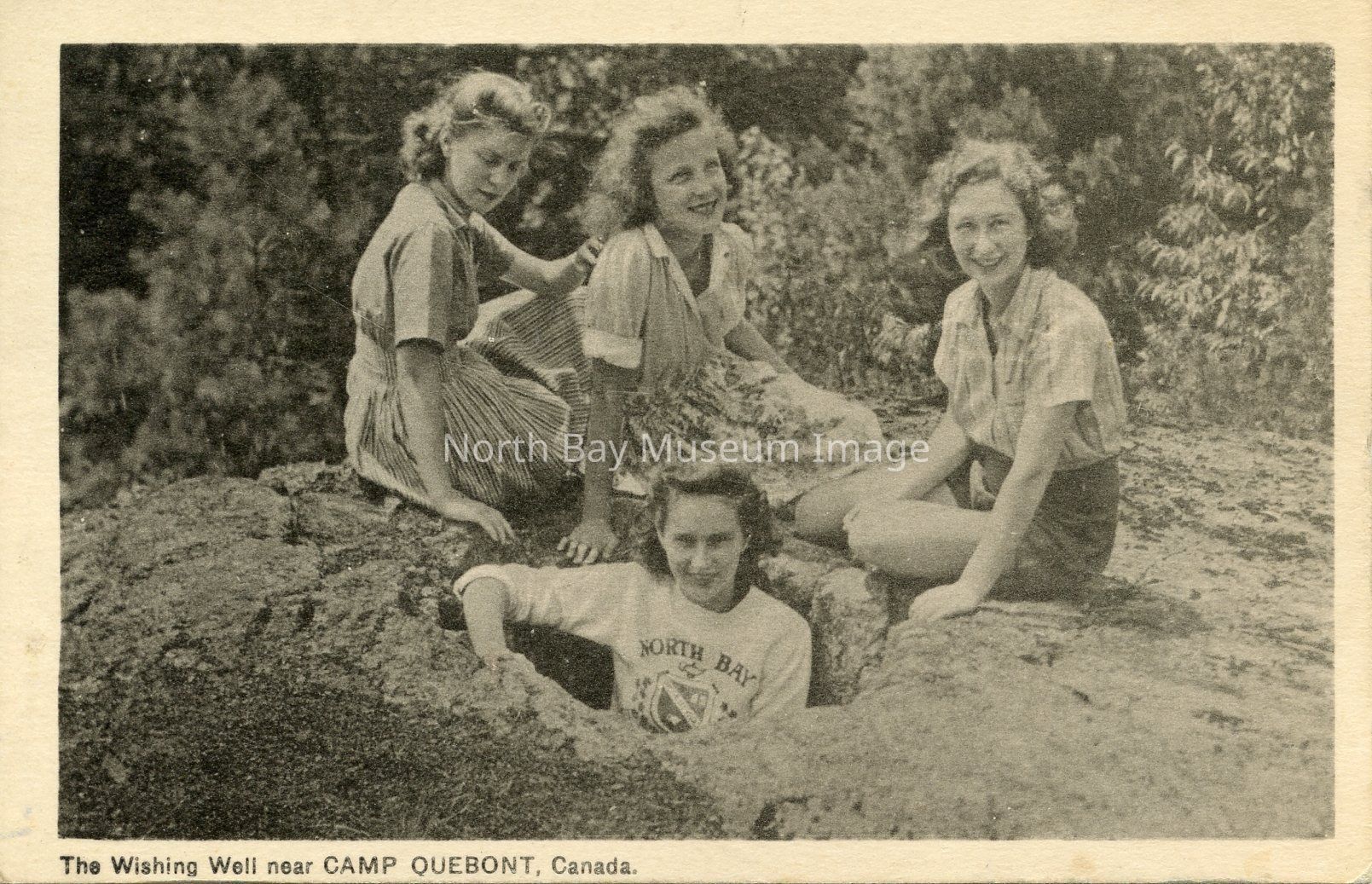 This is a black and white postcard entitled "The Wishing Well near Camp Quebont, Canada." This image shows three girls sitting on top of a large rock. There is one girl who is sitting inside of a hole in the well. The girl sitting in the well has a North Bay t-shirt on. In the background there is lots of different types of trees and vegatation.