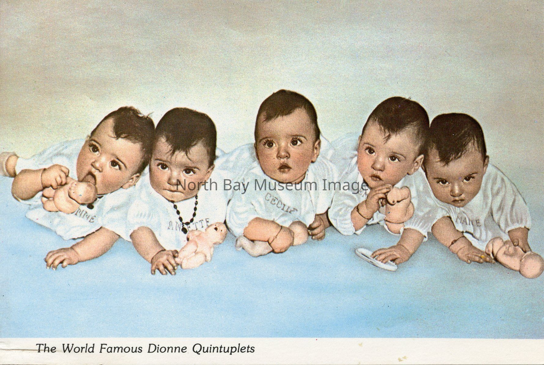 This is a coloured, horizontal postcard. The subject of the postcard is the Dionne quintuplets. The postcard features a photograph of the quints as babies. They are all sitting on a blue blanket wearing white dresses with their names on it. Each of the girls is holding a doll.