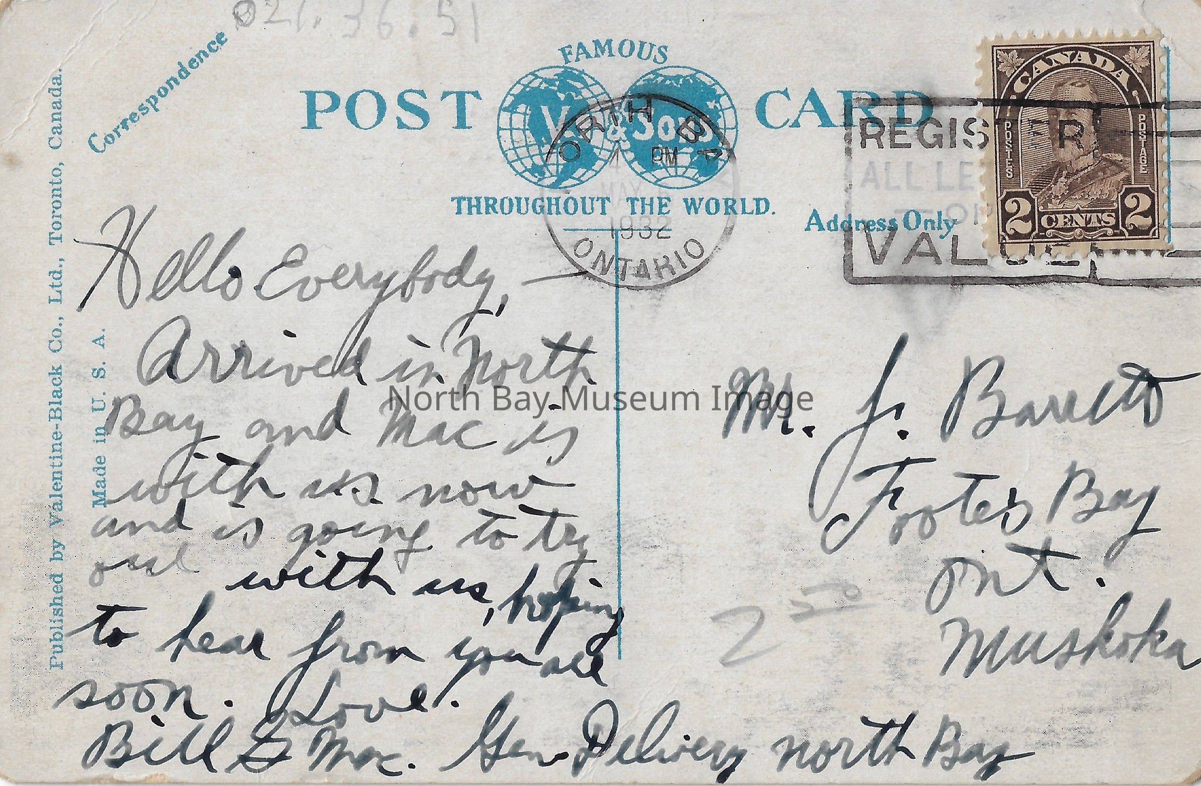 This is a coloured, painted postcard. The card is of a sign saying "Tilden Lake Camp Site." There is a dirt path in front of the sign. In the background are two small camp buildings as well as a lake. The postcard also depicts a sunset. The title of the postcard is: "Tilden Lake Camp Site, Ferguson Highway, Northern Ontario, Canada.". Inscription on back: "Hello everybody, Arrived in North Bay Bay and Mac is with us now and is going to try out with us, hoping to hear from you all soon. Love, Bill & Mrs. ... North Bay. Mr. J. B... Footes Bay Ont. Muskoka".