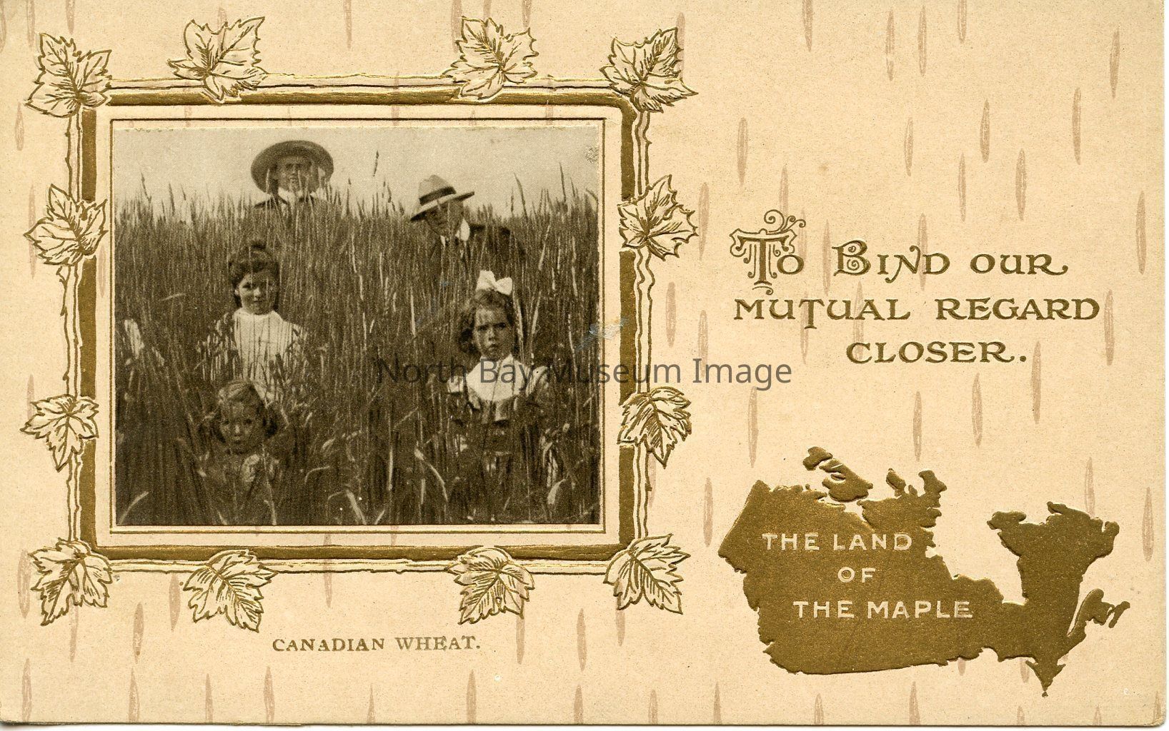 On the left hand side of the post card there is a picture of three children and two men standing in the wheat fields. The picture is surrounded by a brown and white border that has maple leaves attached to it. There are four maple leaves on each side of the border - making sixteen in total. Underneath the picture there is a small caption, in brown capital lettering saying: "CANADIAN WHEAT."