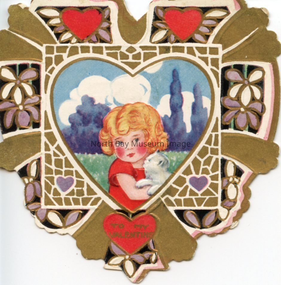 1 beige heart-shaped Valentines day card. The front of the card has a floral boarder with an image in the middle of the card of a little girl in a red dress holding a kitten on top of a hill. The front says 'To My Valentine.'