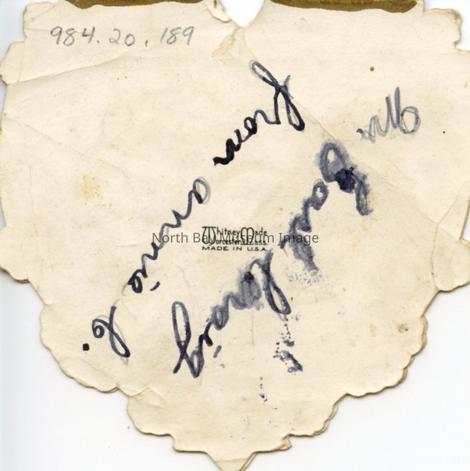 1 brown heart-shaped Valentine's Day card, approx. 3 inch x 3 inch, from Annie C. Whitney Made, Worcester Mass., made in U.S.A. The front of the card is colourful and says 'To My Valentine.' It also has an image of a little girl and boy in the center.