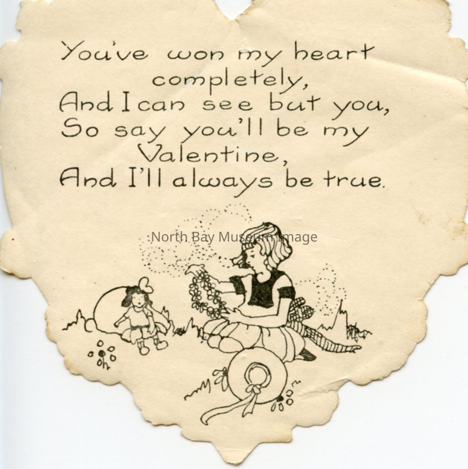 The inscription of the card says "you've won my heart completely, and I can see no one but you, so say you'll be my Valentine, and I'll always be true." The image on the card shows a girl playing with dolls.