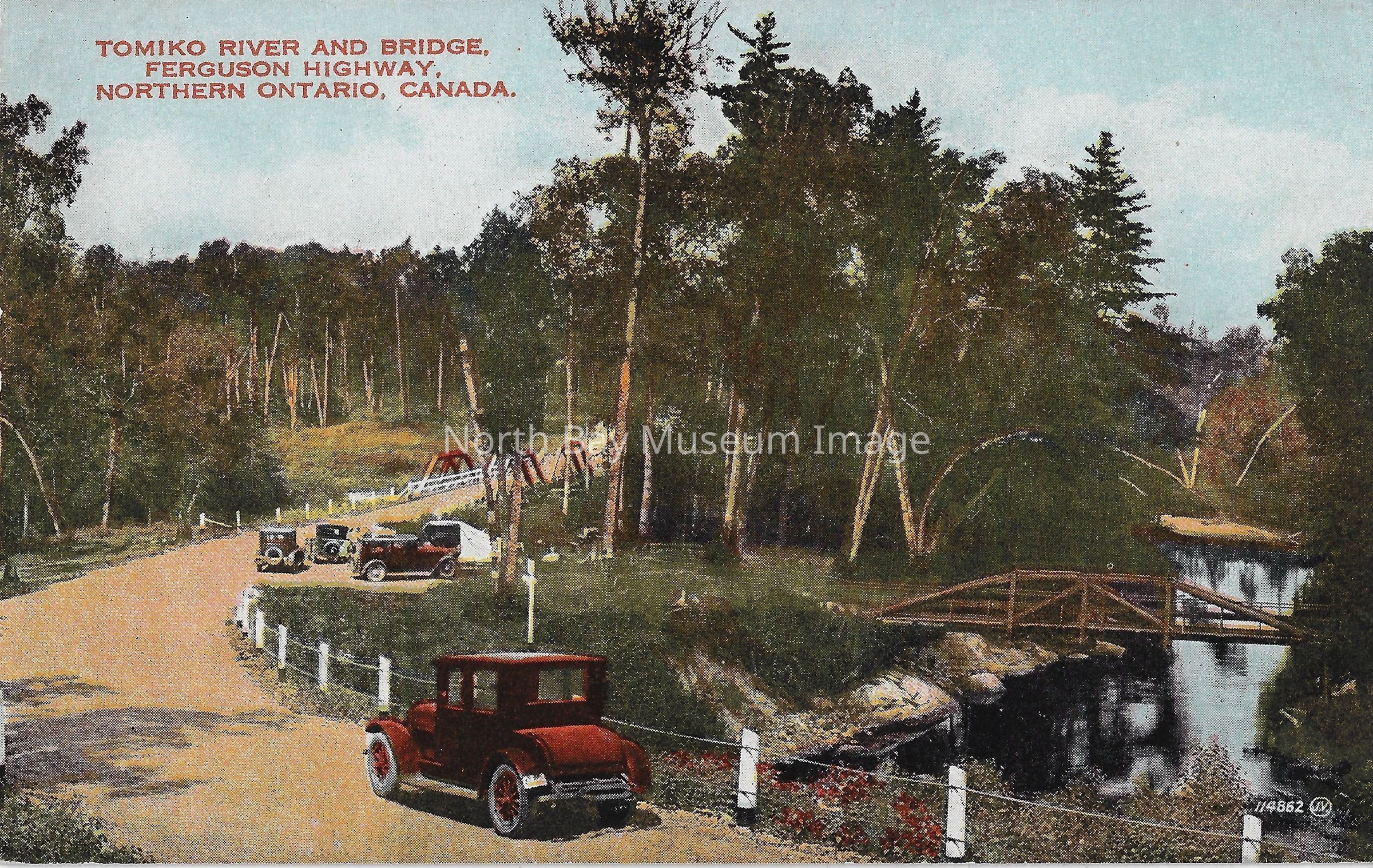 This is a postcard, that is coloured and painted. The postcard shows various cars parked on the side of a dirt road. On the right hand side is a metal bridge connecting the road over a body of water. The bridge and the forested area around the body of water appears to be a popular site for people to visit. The inscription of the card reads: "Tomiko River and Bridge, Ferguson Highway, Northern Ontario, Canada.", "JV".Date(s) of Creation